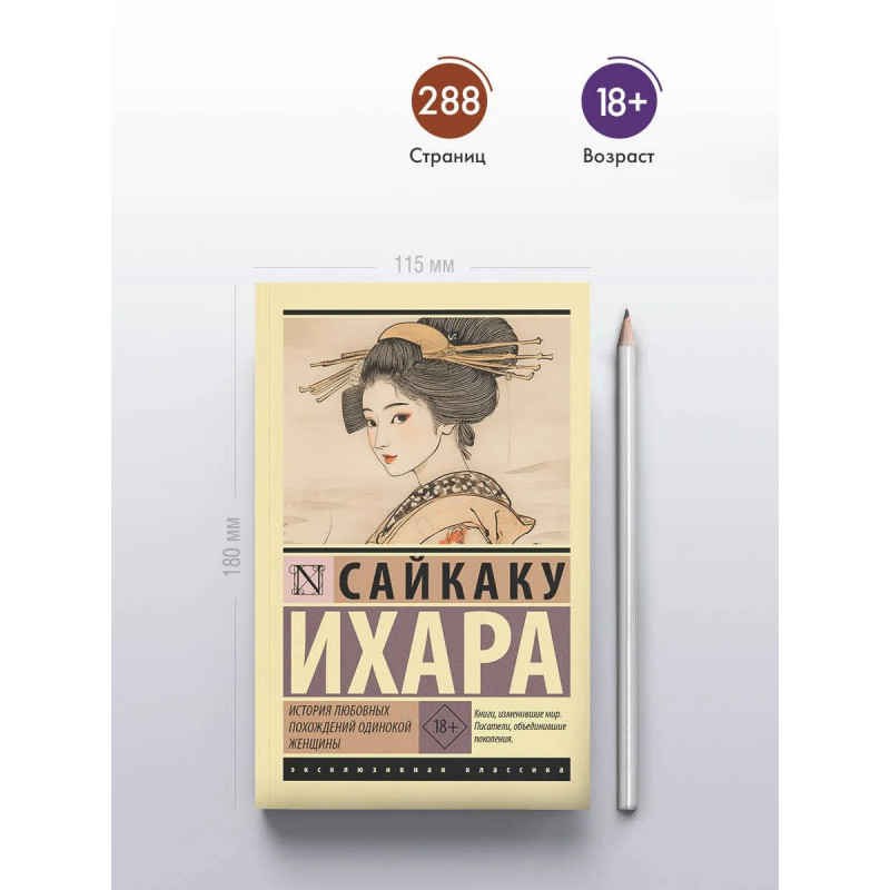 — Ихара Сайкаку — выдающийся японский прозаик и поэт XVII века, за свой талант к импровизации прозванный «мастером двадцати тысяч строк». — Сайкаку — родоначальник целого направления в японской прозе — повестей о бренном мире, укиё-дзоси, но в первую очередь он прославился повестями о любви, косёку-моно. — «История любовных похождений одинокой женщины» — самая известная история в жанре повестей о любви. — В данное издание вошел также сборник «Пять женщин, предавшихся любви», повествующий о пяти женщинах, которые презрели законы быта и морали, прислушавшись к своему сердцу. — Издание в серии «Эксклюзивная классика» — в удобном карманном формате и узнаваемом оформлении.