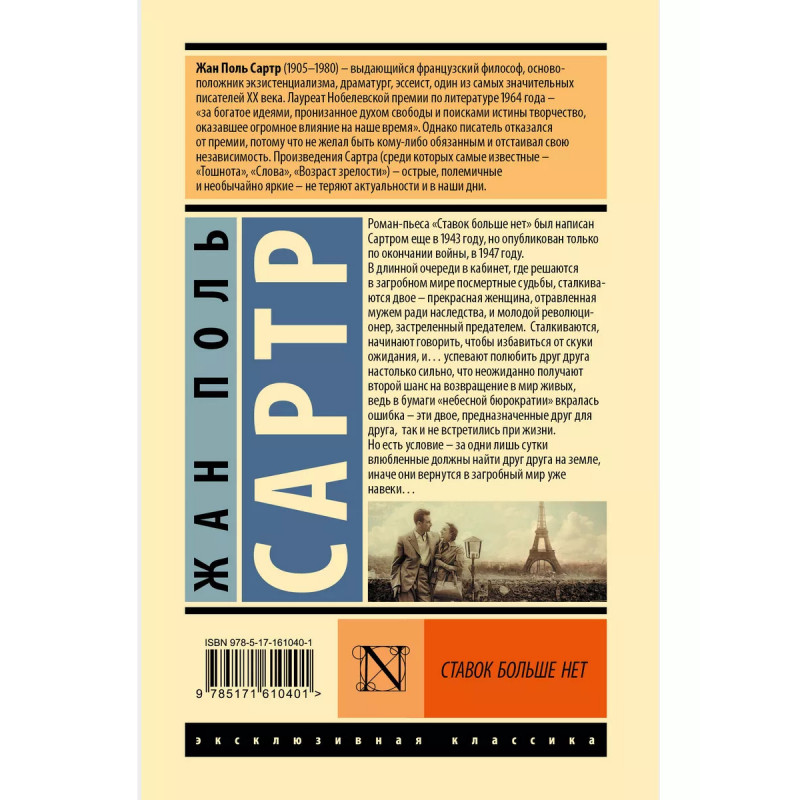 Ставок больше нет. Роман-пьеса "Ставок больше нет" был написан Сартром еще в 1943 году, но опубликован только по окончании войны, в 1947 году. В длинной очереди в кабинет, где решаются в загробном мире посмертные судьбы, сталкиваются двое - прекрасная женщина, отравленная мужем ради наследства, и молодой революционер, застреленный предателем. Сталкиваются, начинают говорить, чтобы избавиться от скуки ожидания, и успевают полюбить друг друга настолько сильно, что неожиданно получают второй шанс на возвращение в мир живых, ведь в бумаги "небесной бюрократии" вкралась ошибка - эти двое, предназначенные друг для друга, так и не встретились при жизни. Но есть условие - за одни лишь сутки влюбленные должны найти друг друга на земле, иначе они вернутся в загробный мир уже навеки
