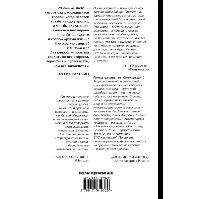 Семь жизней. "Семь жизней - как тот сад расходящихся тропок, когда человек встаёт на одну тропку, а мог бы сделать шаг влево или шаг вправо и прийти... куда-то в совсем другую жизнь? Или другую смерть? Или туда же? Эта книжка - попытка сходить во все стороны, вернуться и пересказать, чем всё закончится". Захар Прилепин "Прилепин пытается прослеживать разные ветки судьбы, находить в прошлом развилки - и смотреть, как бы всё обернулось, если бы в каждой из них можно было повернуть один маленький, неприметный винтик. Настоящая большая литература; сама жизнь, отлитая в слова, и беспримесное читательское счастье". Галина Юзефович, "Meduza" "Семь жизней - пожалуй, самая личная книга Захара Прилепина. Здесь очень много самого автора: с его неизжитой болью, неистовой любовью, неутолённой яростью. Эта книга - воспроизведённое молчание: ты хочешь о чём-то спросить своего собеседника, но понимаешь, что тебе не ответят, потому что там, в глубине, клокочет то, о чём не принято говорить, да и слов таких будто бы нет Вот ты и не с