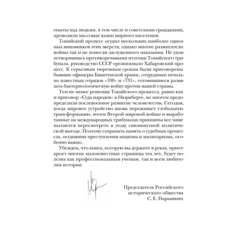 Международный трибунал в Токио 1946–1948 годов поставил окончательную точку во Второй мировой войне. Здесь были осуждены зачинщики военных действий в Китае и Манчжурии, «самураи», движимые целями завоевания мирового господства, порабощения малых народов и утверждения права «избранных» не соблюдать никаких правил в отношении «низших» рас.