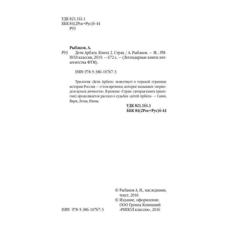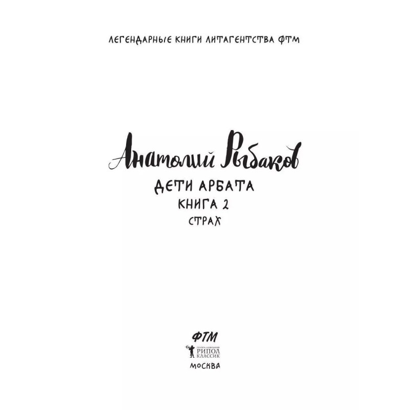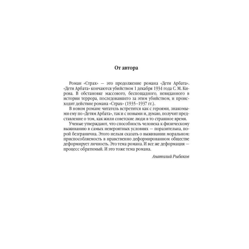 Трилогия "Дети Арбата" повествует о горькой странице истории России - о том времени, которое называют "периодом культа личности". В романе "Страх" (вторая книга трилогии) продолжается рассказ о судьбах "детей Арбата" - Саши, Вари, Лены, Нины.