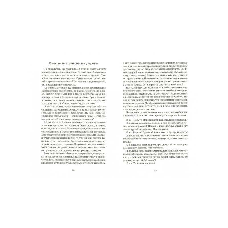 Новая книга писательницы Ирады Вовненко и журналиста, генерального директора газеты "Коммерсанта в Санкт-Петербурге" Максима Ефимова - это попытка понять, что же такое сегодняшние мужчина и женщина. Нарушая каноны эпистолярного жанра, авторы создали захватывающий роман-исследование о бесконечном желании любви и счастья, которому подвластны все, от романтичной девушки-подростка до прожженного, "повидавшего жизнь" циника.