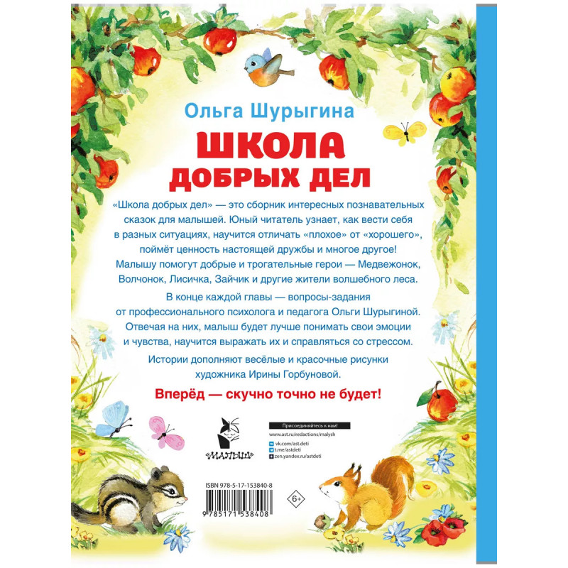 Книга "Школа добрых дел" - это сборник интересных психотерапевтических сказок для малышей. Юный читатель подружится с добрыми героями, узнает, как вести себя в разных ситуациях, научится отличать "плохое" от "хорошего". В конце каждой сказки дети и родители найдут простые, но эффективные упражнения от автора книги - Ольги Шурыгиной. Отвечая на них, малыш научится справляться со стрессом и выражать свои чувства. Ольга Шурыгина - социальный психолог с большим стажем, педагог писатель. Ольга точно знает, как сделать так, чтобы знакомство ребёнка с окружающим миром проходило безболезненно и спокойно, без капризов, стрессов и истерик. Чтобы помочь малышу, нужно обратиться к сказкотерапии - это метод, который использует сказку для решения вопросов воспитания, образования и поведения ребёнка. Тексты написаны простым языком, с яркими героями и живыми примерами. Такие произведения помогают малышу справиться со страхами и научиться понимать свои чувства.