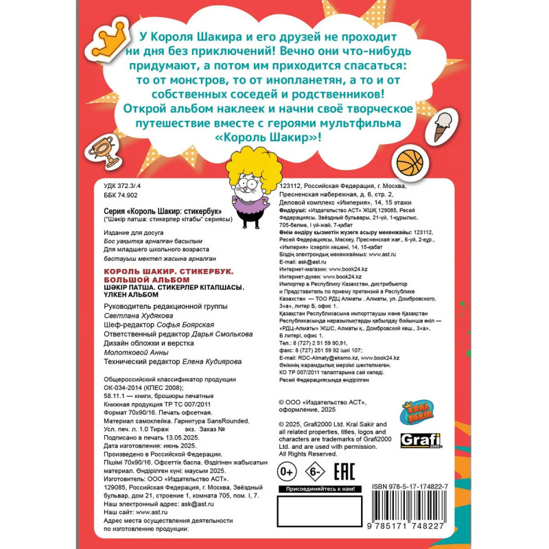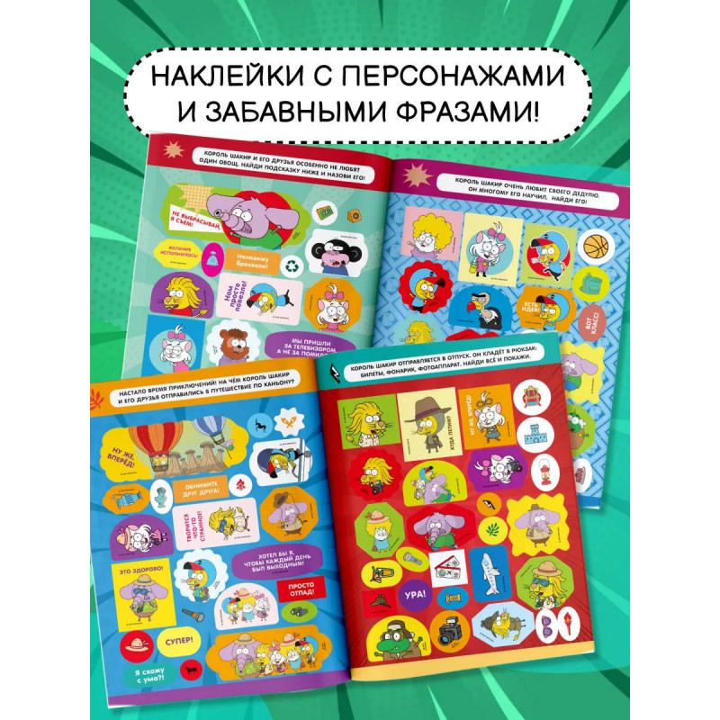 В нашем альбоме ты найдёшь всех своих любимых персонажей и цитаты из мультфильма «Король Шакир». Приключения на каждой странице! Тебя ждут увлекательные небольшие задания, яркие наклейки, запоминающиеся фразы. Отправляйся в путешествие с Королём Шакиром, его семьёй и друзьями. И тебе точно не придётся скучать ни минуты! Эти наклейки идеально подходят для украшения тетрадей, дневников, телефона и других любых поверхностей, так любимые персонажи будут всегда с тобой!