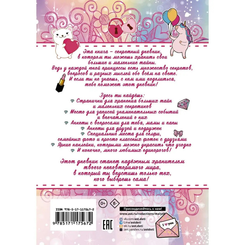 У каждой девочки есть секреты (и совсем маленькие секретики), из которых складывается её неповторимый мир. Школа, увлечения, общение с мамой и папой, братьями и сёстрами, друзьями и подружками, домашними питомцами... И всё это вызывает целую палитру чувств и оригинальные мысли обо всём на свете! Эта красочная книга тоже с секретом. Точнее, она сама -- секрет. Ты держишь в руках дневник, в который можно поместить все свои тайны и хранить их, никому не показывая. Или дать почитать избранные места тем, кому пожелаешь. А еще ты можешь ответить на вопросы анкеты о себе, своих родных и близких... Вот увидишь: пройдёт какое-то время, и не только тебе, но и им будет интересно вспомнить, каким он был -- яркий и цветной мир, навсегда запечатленный на страничках твоего дневника. Для дошкольного возраста.