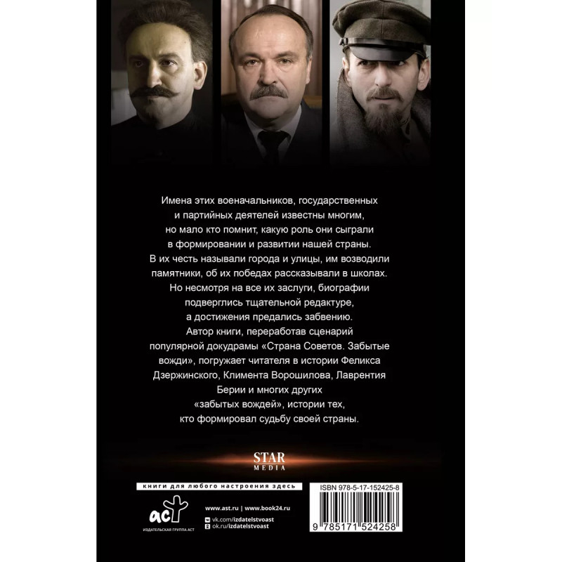 Страна Советов. Забытые вожди. Имена этих военачальников, государственных и партийных деятелей известны многим, но мало кто помнит, какую роль они сыграли в формировании и развитии нашей страны. В их честь называли города и улицы, им возводили памятники, об их победах рассказывали в школах. Но несмотря на все их заслуги, биографии подверглись тщательной редактуре, а достижения предались забвению. Автор книги, переработав сценарий популярной докудрамы "Страна Советов. Забытые вожди", погружает читателя в истории Феликса Дзержинского, Климента Ворошилова, Лаврентия Берии и многих других "забытых вождей", истории тех, кто формировал судьбу своей страны.