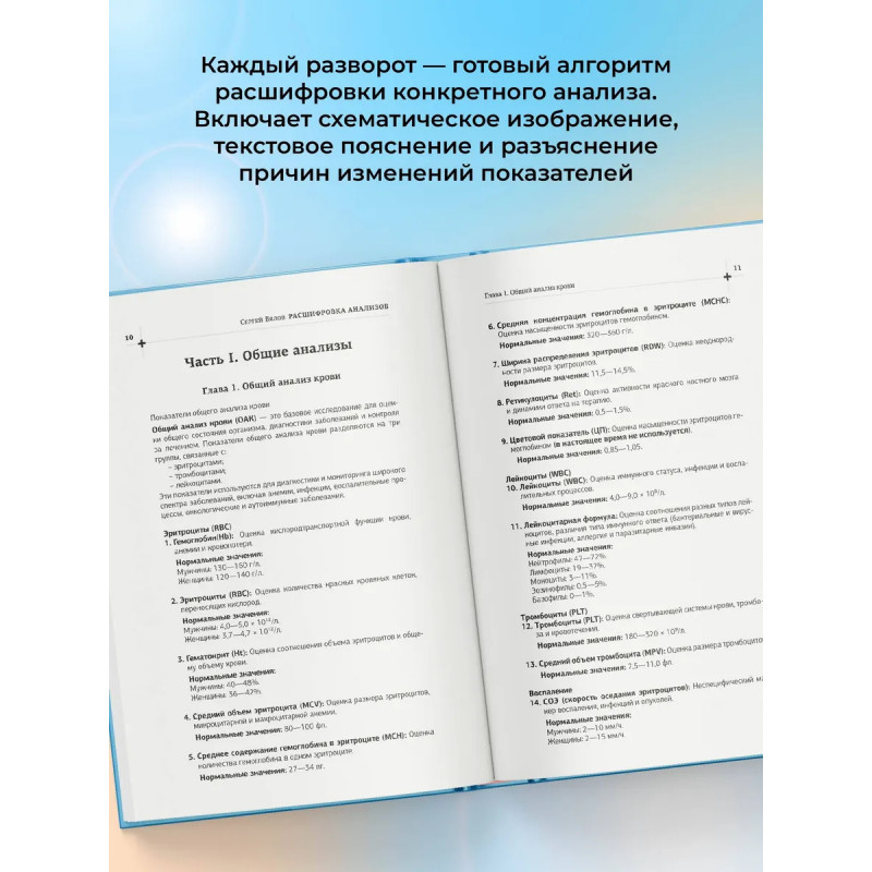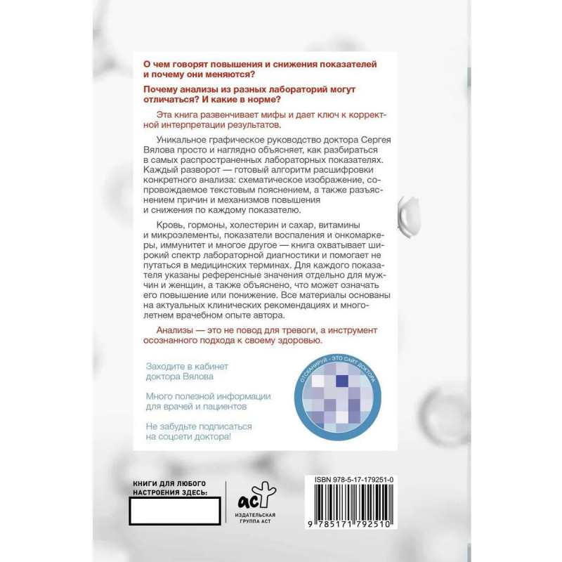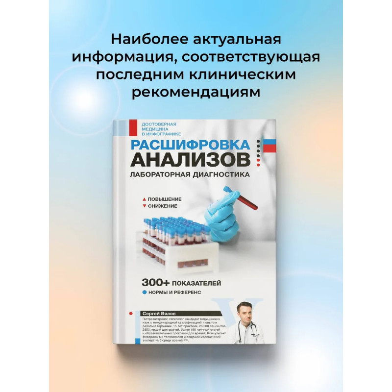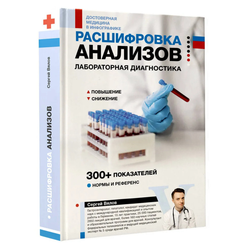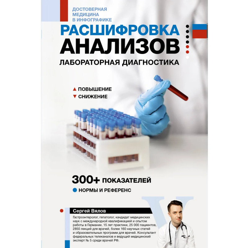 Почему анализы из разных лабораторий могут отличаться? О чем говорят повышения и снижения показателей и почему они меняются? Эта книга развенчивает мифы и дает ключ к корректной интерпретации результатов. Уникальное графическое руководство доктора Сергея Вялова просто и наглядно объясняет, как разбираться в самых распространенных лабораторных показателях. Каждый разворот — готовый алгоритм расшифровки конкретного анализа: схематическое изображение, сопровождаемое текстовым пояснением, а также разъяснением причин и механизмов повышения и снижения по каждому показателю. Кровь, гормоны, холестерин и сахар, витамины и микроэлементы, показатели воспаления и онкомаркеры, иммунитет и многое другое — книга охватывает широкий спектр лабораторной диагностики и помогает не путаться в медицинских терминах.