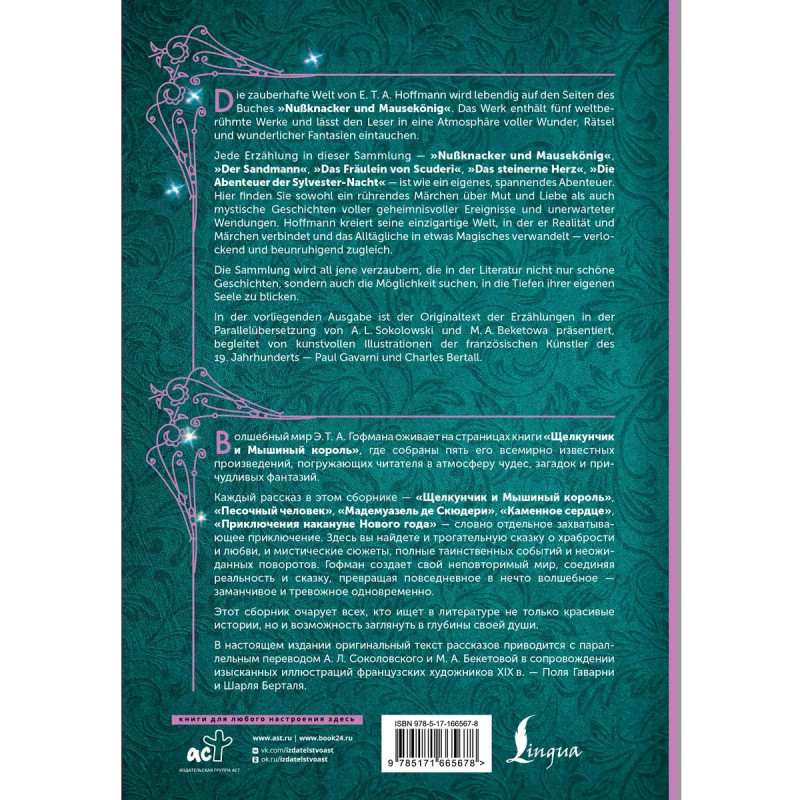 Сборник "Щелкунчик и Мышиный король" приглашает читателя в волшебный мир Э. Т. А. Гофмана. На страницах книги оживают поистине чарующие и загадочные сюжеты. Пять всемирно известных произведений – "Щелкунчик и Мышиный король", "Песочный человек", "Мадемуазель де Скюдери", "Каменное сердце", "Приключения накануне Нового года" – переносят в мир, где граница между реальностью и чудесами едва различима.