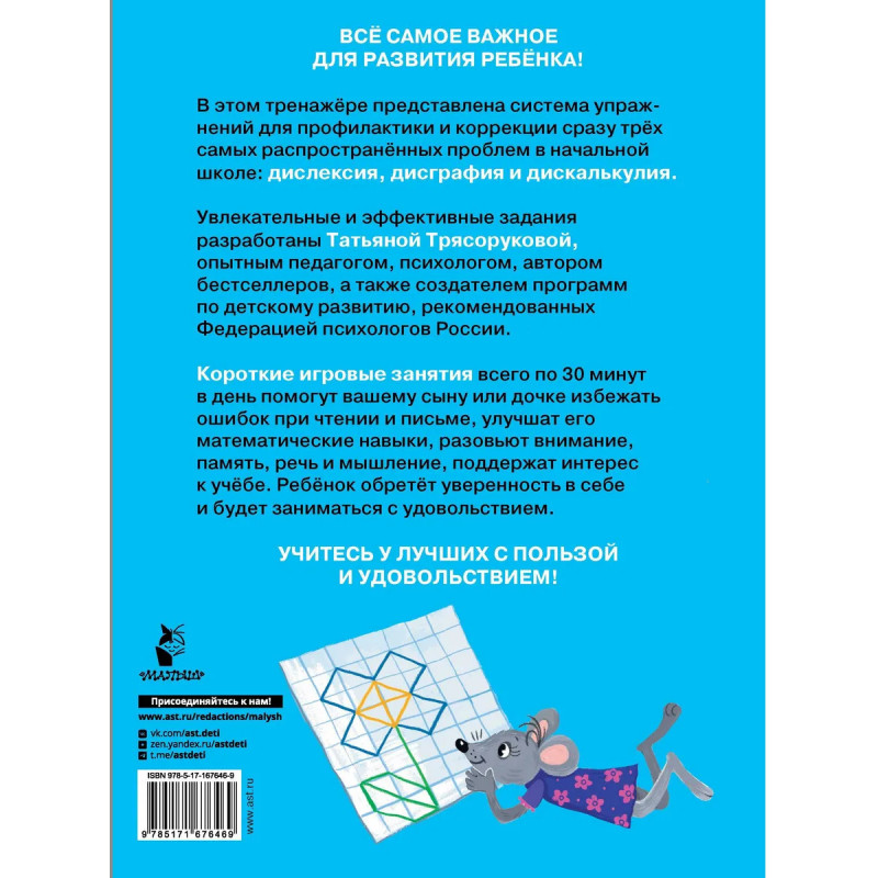 Как помочь ребенку учиться легко и с удовольствием! Что делать, если у него возникают трудности при чтении и письме. Автор книги Татьяна Трясорукова, опытный психолог и педагог, автор программ, рекомендованных Федерацией психологов России, составила специальный комплекс упражнений для профилактики дислексии и дисграфии. Тренажер поможет справиться с распространенными ошибками, улучшить математические способность, развить логику, память и мышление. Веселые картинки, интересные задания сделают занятия не только полезными, но и интересными. Ребёнок с удовольствием будет заниматься самостоятельно. Книга ориентирована на развитие речи, памяти, интеллекта и грамотного письма.