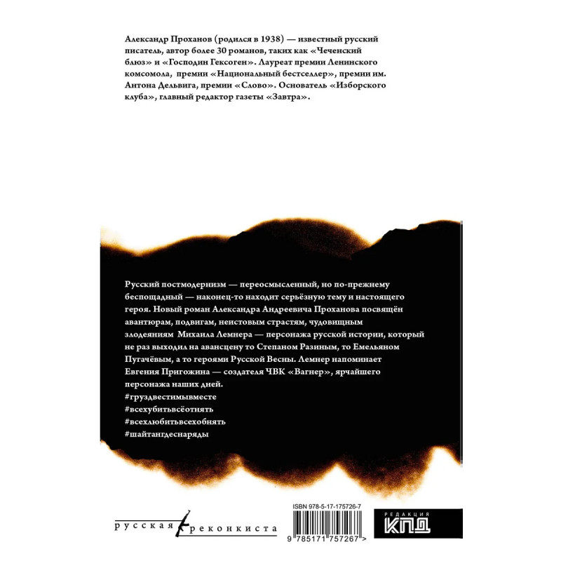– Новый роман Александра Проханова о герое наших дней — Евгении Пригожине, основателе ЧВК «Вагнер». – Автор — известный российский писатель, создавший роман «Господин Гексоген», изданный тиражом более 20 тысяч экземпляров, лауреат литературной премии «Национальный бестселлер». – Роман «Лемнер», как и другие произведения автора последних лет, сочетает реалии современной политической жизни России с элементами мистики и фантасмагории. – Стильные авторские иллюстрации внутри. – Серия «Русская Реконкиста» редакции Захара Прилепина «КПД».