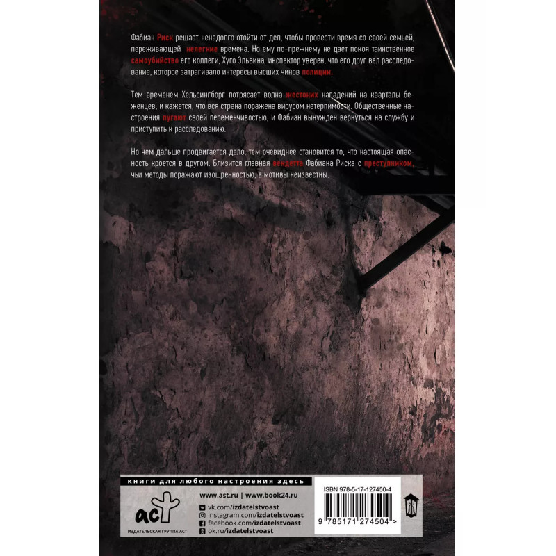 Мотив Х. " Новый роман от короля шведского триллера Стефана Анхема. " "Мотив Х" продолжает цикл об инспекторе Фабиане Риске. " Романы Стефана Анхема читают в 30 странах. " Цепляет сильнее, чем Ю Несбё. В приморском Хельсингборге происходит жестокое убийство мальчика-сирийца. Общественные настроения быстро меняются, а нападки на кварталы беженцев не прекращаются. Город вот-вот потрясет нечто непоправимое. Тем временем инспектор Фабиан Риск на время оставляет службу. Его семья проходит через тяжелые испытания, а самого Фабиана терзает зависимость и мысли о смерти коллеги Хуго Эльвина. Смерть последнего произошла при странных обстоятельствах, и Фабиан намерен докопаться до правды. Обстановка в Хельсингборге накаляется, и инспектора Риска срочно подключают к расследованию. Фабиан погружается в новое дело, но с каждым шагом он понимает, что истинная опасность вовсе не там, где все думают. И вскоре Риску придется выйти на изощренного преступника, которого невозможно поймать - его шаги непредсказуемы.