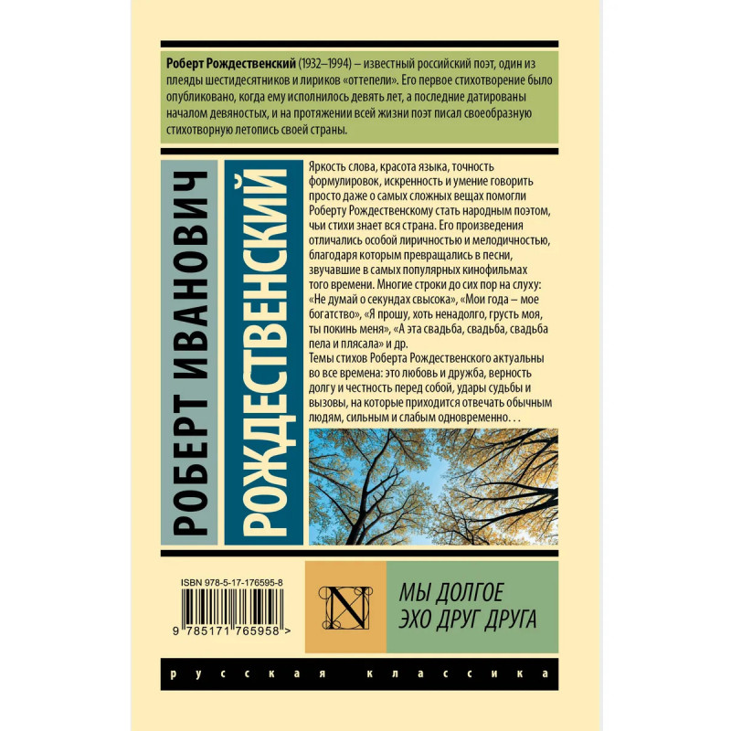 Роберт Рождественский (1932–1994) – известный российский поэт, один из плеяды шестидесятников и лириков «оттепели». Его первое стихотворение было опубликовано, когда ему исполнилось девять лет, а последние датированы началом девяностых, и на протяжении всей жизни поэт писал своеобразную стихотворную летопись своей страны. Яркость слова, красота языка, точность формулировок, искренность и умение говорить просто даже о самых сложных вещах помогли Роберту Рождественскому стать народным поэтом, чьи стихи знает вся страна. Его произведения отличались особой лиричностью и мелодичностью, благодаря которым превращались в песни, звучавшие в самых популярных кинофильмах того времени. Многие строки до сих пор на слуху: «Не думай о секундах свысока», «Мои года — мое богатство», «Я прошу, хоть ненадолго, грусть моя, ты покинь меня», «А эта свадьба, свадьба, свадьба пела и плясала» и др.