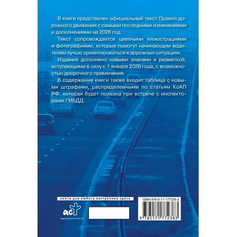 В книге представлен официальный текст Правил дорожного движения с самыми последними изменениями и дополнениями на 2026 год. Текст сопровождается цветными иллюстрациями и фотографиями, которые помогут начинающим водителям лучше ориентироваться в дорожных ситуациях. Издание дополнено новыми знаками и разметкой, вступающие в силу с 1 января 2026 года с возможностью досрочного применения. В содержание книги также входит таблица с новыми штрафами, распределенными по статьям КоАП РФ, которая будет полезна при встрече с инспекторами ГИБДД. Издание учитывает все изменения, опубликованные в официальных источниках на момент подписания издания в печать.