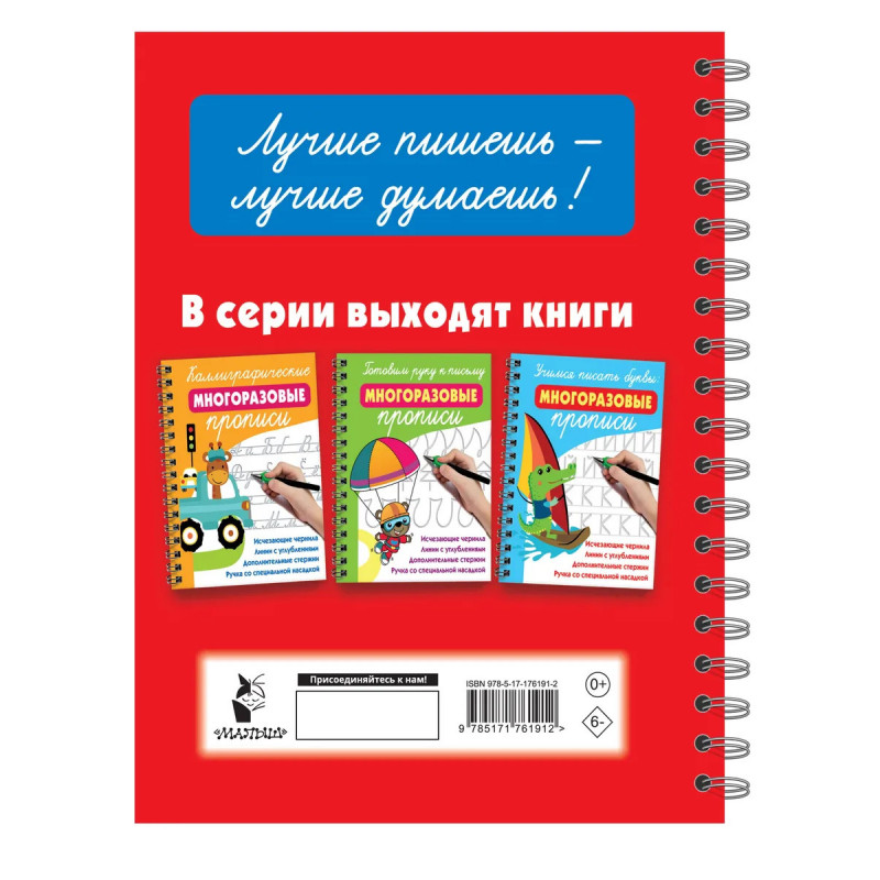 У ребёнка плохой почерк? Хотите исправить? Тогда вам точно пригодятся наши многоразовые прописи! Методика обучения соответствует ФГОС: сначала отрабатываем написание элементов буквы, и только потом прописываем букву целиком. Очень помогают образцы букв со стрелками, указывающими направление и последовательность правильного написания. Специальные углубления-канавки будто сами ведут руку ребёнка — каждая буква получается каллиграфической с первого раза. В комплекте с прописями идут ручка с волшебными исчезающими чернилами, дополнительные стержни и насадка для правильной постановки руки. Исчезающие чернила делают процесс обучения увлекательным и позволяют тренироваться много-много раз! Ребёнок сможет осваивать новые умения без страха совершить ошибку, вырабатывая не только красивый почерк и чистописание, но и уверенность в себе. Универсальная насадка (подходит для левши и правши) учит держать ручку под правильным углом и помогает избежать зажима кисти.
