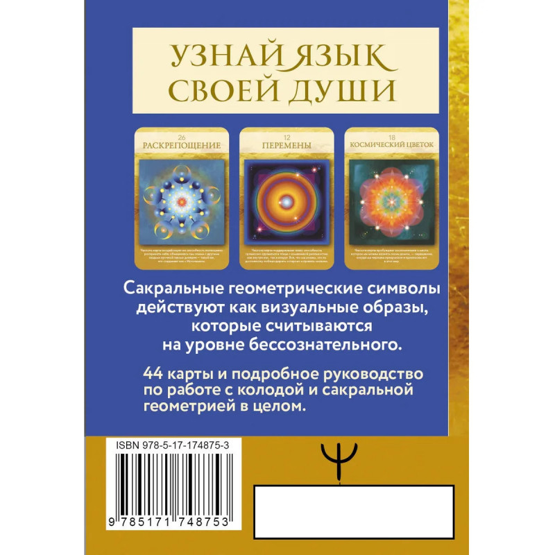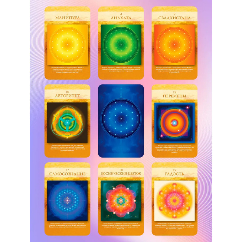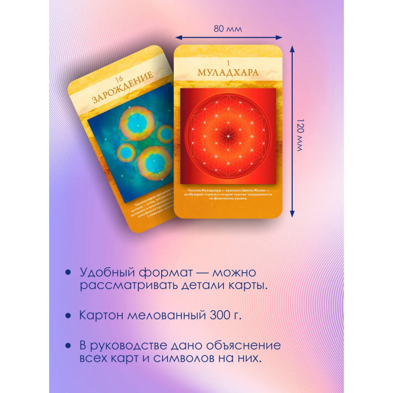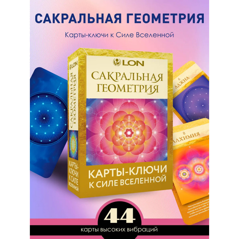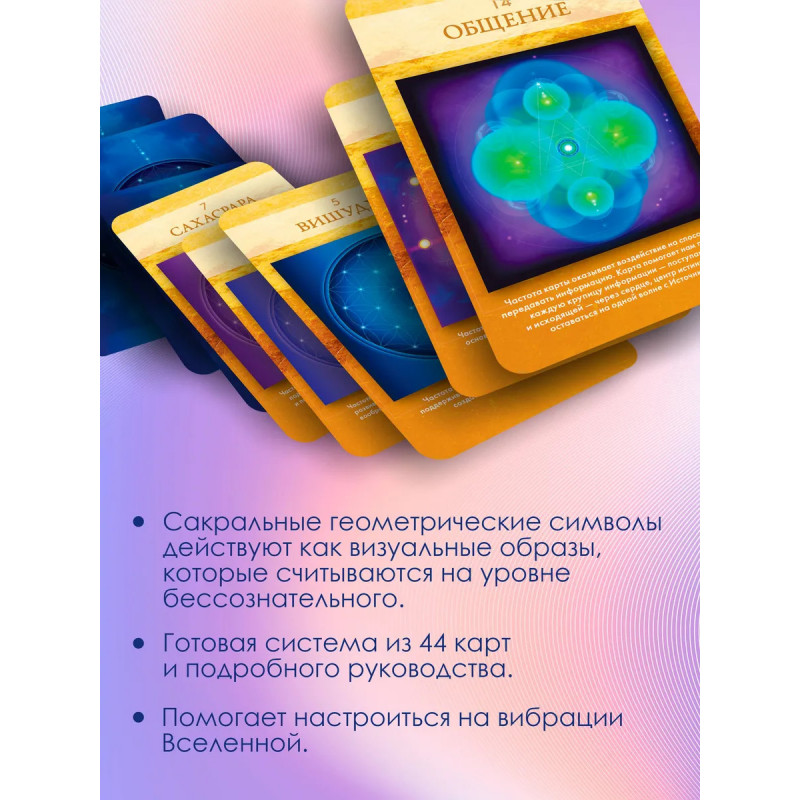 Представьте, что человек — это магнит, который притягивает все, что ему подобно: счастливый человек притягивает счастье, общительный человек притягивает новых людей и т. д. Но что делать, если в определенный период притягиваются только неудачи и проблемы? Помимо активных действий в физическом мире (это в первую очередь!), можно работать еще и с миром энергий — повышать частоту своих вибраций. Формула простая: чем выше вибрации, тем больше положительного вы притягиваете в свою жизнь. В этом поможет колода "Сакральной геометрии". Геометрические фигуры, изображенные на картах, и то, как именно они расположены, работают как визуальные инструменты, помогающие активировать тонкие энергии вокруг и внутри вас. Так происходит настройка на нужные вибрации более высокой частоты. В колоде есть карты Любви, Божественной Женщины, Коммуникации — все эти вибрации закодированы в них.