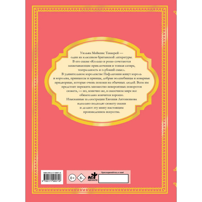 Уильям Мейкпис Теккерей — один из классиков британской литературы. В его сказке "Кольцо и роза" сочетаются захватывающие приключения и тонкая сатира, яркая театральность и глубокий смысл. В удивительном королевстве Пафлагония живут король и королева, принцессы и принцы, добрые волшебницы и коварные придворные, которые очень похожи на обычных людей. Всем им предстоит пережить множество невероятных поворотов сюжета, — но, конечно же, в сказочном мире все обязательно кончится хорошо. Изысканные иллюстрации Евгения Антоненкова идеально подходят сюжету сказки и делают эту книгу настоящим произведением искусства.