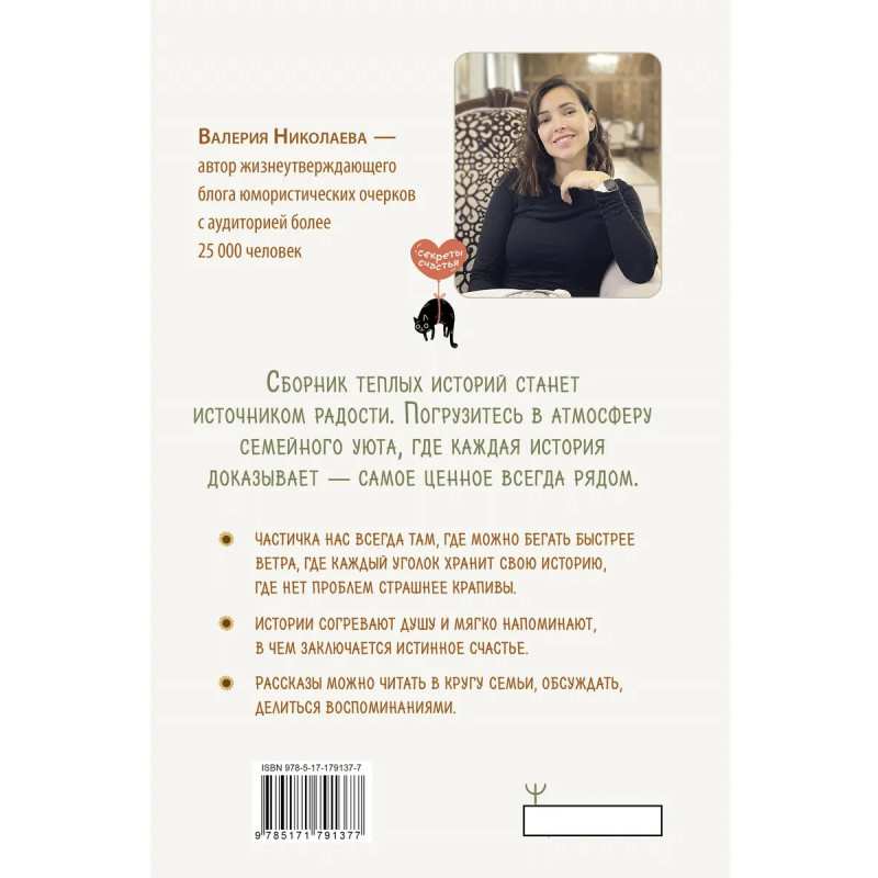 Валерия Николаева — пиарщик, копирайтер и автор жизнеутверждающего блога юмористических очерков с аудиторией 25 000 человек. Где живет настоящее счастье? В уютном кирпичном доме, который с любовью строил папа. В знакомом аромате только что испеченных маминых пирогов. В заливистом смехе сестер, вспоминающих забавные детские проделки. На страницах книги оживает целый мир, где радость находят в самых простых вещах: в дружной лепке пельменей, в сборе душистых лесных ягод, в велосипедных прогулках по деревенским дорогам. Колоритные соседи, вечно голодные коты и другие обитатели становятся неотъемлемой частью этой большой семьи. Каждая история — драгоценный кусочек того самого семейного счастья, которое скрывается в милых сердцу мелочах и примагничивается к позитивным людям. Позвольте им согреть ваше сердце!