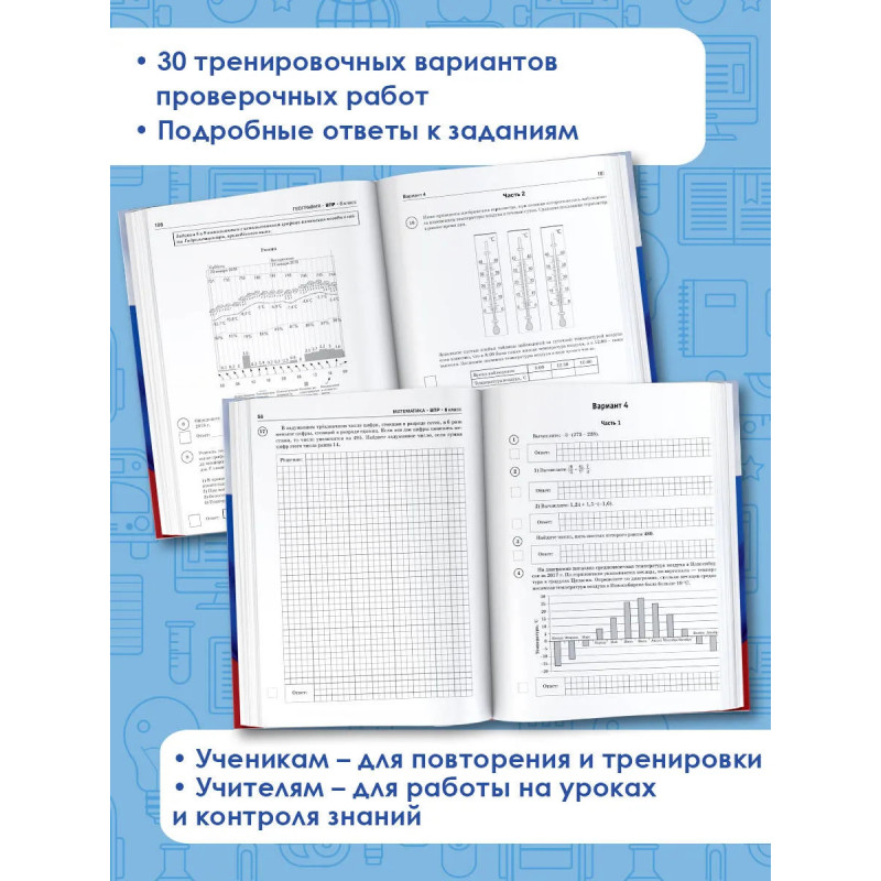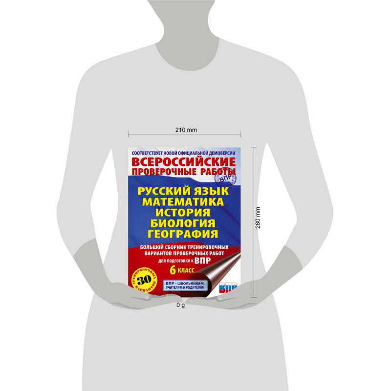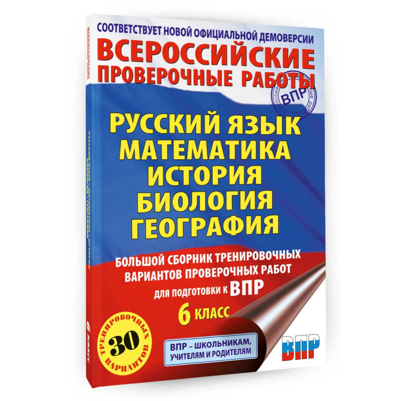 Данное пособие предназначено для учащихся 6-х классов общеобразовательных организаций. Оно позволяет в кратчайшие сроки проверить свои знания, потренироваться в выполнении заданий и тем самым успешно подготовиться к выполнению Всероссийских проверочных работы по итогам обучения в течение года. Пособие содержит 30 тренировочных вариантов проверочных работ по РУССКОМУ ЯЗЫКУ, МАТЕМАТИКЕ, ИСТОРИИ, ОБЩЕСТВОЗНАНИЮ, ФИЗИКЕ, БИОЛОГИИ, ГЕОГРАФИИ И АНГЛИЙСКОМУ ЯЗЫКУ — предметам, по которым пишут ВПР в 6 классе на всей территории страны. Содержание проверочных работ соответствует Федеральному государственному образовательному стандарту основного общего образования. Каждый вариант составлен в полном соответствии с демонстрационными вариантами, представленными на информационном портале по Всероссийским проверочным работам. В конце книги даны ответы на все задания, решения и критерии оценивания.