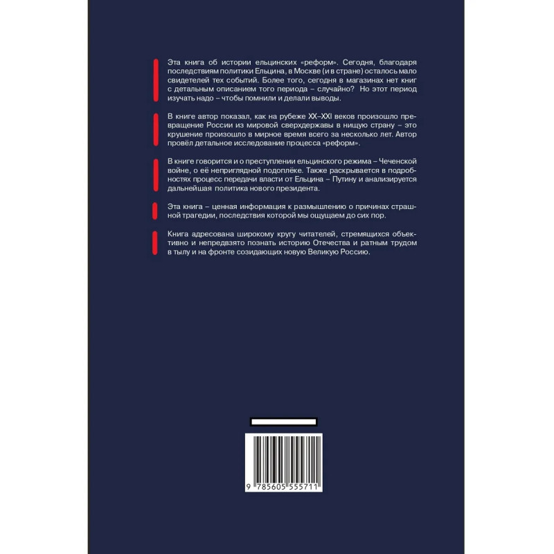 Эта книга об истории ельцинских реформ. Сегодня, благодаря последствиям политики Ельцина, в Москве (и в стране) осталось мало свидетелей тех событий. Более того, сегодня в магазинах нет книг с детальным описанием того периода случайно? Но этот период изучать надо чтобы помнили и делали выводы. В книге автор показал, как на рубеже XXXXI веков произошло превращение России из мировой сверхдержавы в нищую страну это крушение произошло в мирное время всего за несколько лет. Автор провёл детальное исследование процесса реформ. В книге говорится и о преступлении ельцинского режима Чеченской войне, о её неприглядной подоплёке. Также раскрывается в подробностях процесс передачи власти от Ельцина Путину и о дальнейшей политики нового президента.