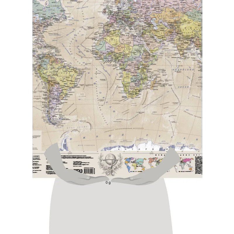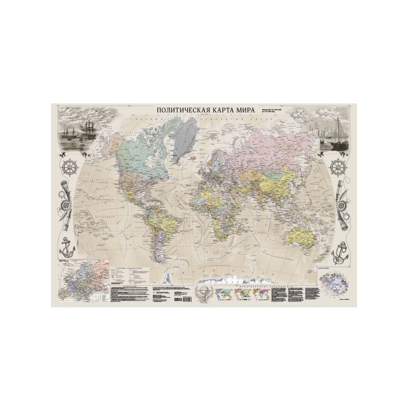 Представляем вашему вниманию одностороннюю настенную карту мира размером 1600×1050 мм. Эта политическая карта охватывает все независимые государства мира, включая Россию в новых границах, а также особые владения и территории с особым статусом. Карта выполнена в изысканном ретро-стиле, стилизована под старинное издание, что придает ей особый шарм и винтажную элегантность. Несмотря на декоративное оформление, картографическая информация остается чёткой и легко читаемой. Политическое деление мира: все государства мира с актуальными границами и обозначением территорий с особым статусом. Отображение населённых пунктов: используются пунсоны трёх размеров, показывающие населённость городов: более 1 млн жителей; от 100 тыс. до 1 млн жителей; менее 100 тыс. жителей. Врезка на Европу: дополнительный масштабный фрагмент карты для детального изучения европейской части мира.
