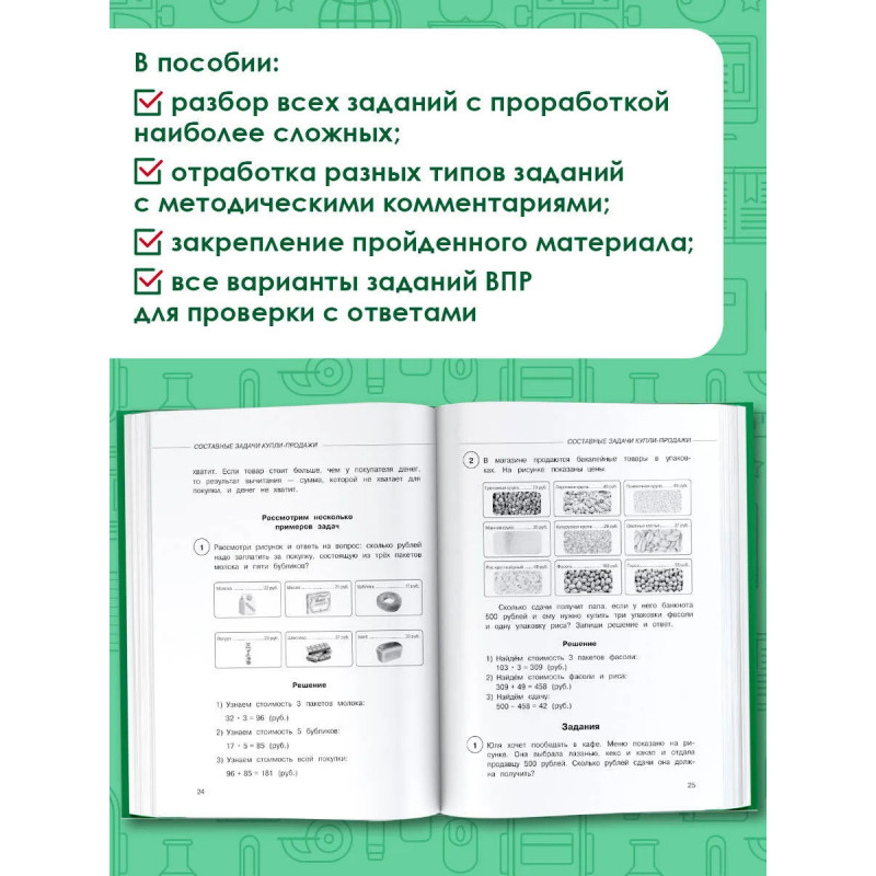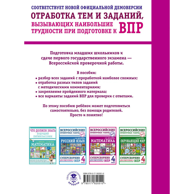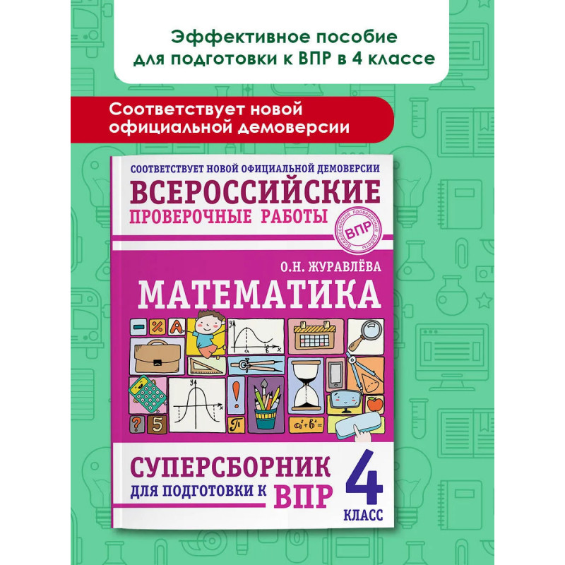 Подготовка младших школьников к сдаче первого государственного экзамена — Всероссийской проверочной работе. В пособии: — разбор всех заданий с проработкой наиболее сложных; — отработка разных типов заданий с методическими комментариями; — закрепление пройденного материала; — все варианты заданий ВПР для проверки с ответами. По этому пособию ребёнок может подготовится самостоятельно, без помощи родителей. Просто и понятно! Выполняя задания «Суперсборника», дети подготовятся к Всероссийской проверочной работе по математике, и ни одно из предложенных заданий не вызовет у них затруднений!