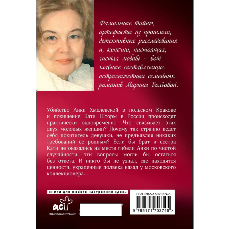 – Семейный детектив от звезды жанра. Для всех, кто любит мелодрамы с остросюжетным элементом. – Фамильные тайны, семейные интриги, скелеты в шкафу и, конечно, настоящая чистая любовь — главные составляющие романов Марины Болдовой. – Переиздание в покете — удобно носить с собой. – Авторская серия «Семейный детектив». Не пропустите другие романы: «И про любовь тоже», «Серебряный капкан для черного ангела» и «Кукла старого Адама».