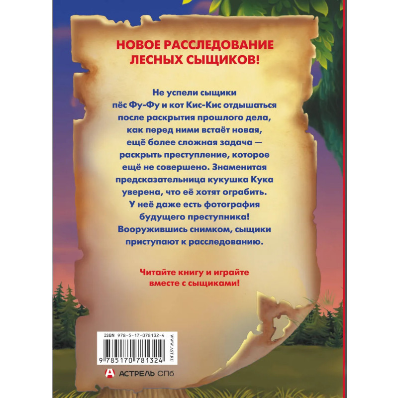 Ненастным вечером знаменитые сыщики пёс Фу-Фу и кот Кис-Кис сидели в детективном бюро, тревожно прислушиваясь к раскатам грома, и чего-то ждали... Вместе с ударом грома дверь распахнулась и на порог влетела взъерошенная птица - известная прорицательница Кука. Кука без труда предсказывала будущее другим, но что она сама станет жертвой преступления, и подумать не могла! Сыщики, вооружившись главной уликой - фотографией преступника, - начинают новое расследование.
