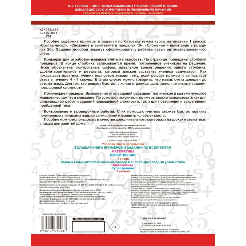 Пособие содержит примеры и задания по базовым темам курса математики 1 класса: «Состав чисел», «Сложение и вычитание в пределах 10», «Сложение и вычитание в пределах 20». В книгу вошли примеры для отработки навыков счёта на скорость с дополнительными заданиями повышенной сложности; логические примеры, выполнение которых развивает логическое и математическое мышление, память и внимание; контрольные и проверочные работы. Задания пособия помогут сформировать у ребёнка навык автоматизированного счёта.