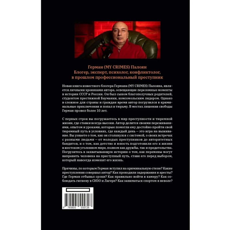 Новая книга известного блогера Германа (MY CRIMES) Палояна, является личными хрониками автора, освещающие переломные моменты в истории СССР и России. Он был сыном благополучных родителей, студентом престижной Бауманки, комсомольским лидером. Однако в сложное для страны и граждан время автор погрузился в криминальные приключения и попал в тюрьму. В местах лишения свободы Герман провел более 10 лет. С первых строк вы погружаетесь в мир преступности и тюремной жизни, где ставки всегда высоки. Автор делится своими переживаниями, опытом и уроками, которые помогли ему достойно пройти свой тюремный путь в условиях, где каждый день - это игра на выживание. Вы узнаете о том, как он столкнулся с системой, о своих встречах с разными людьми - от молодых преступников до авторитетных бандитов, и о том, как детство и юность подготовили его к жизни в жестоком уголовном мире, полном как дружбы, так и предательства.