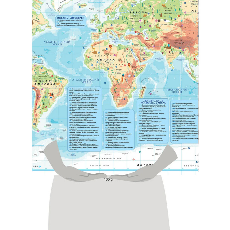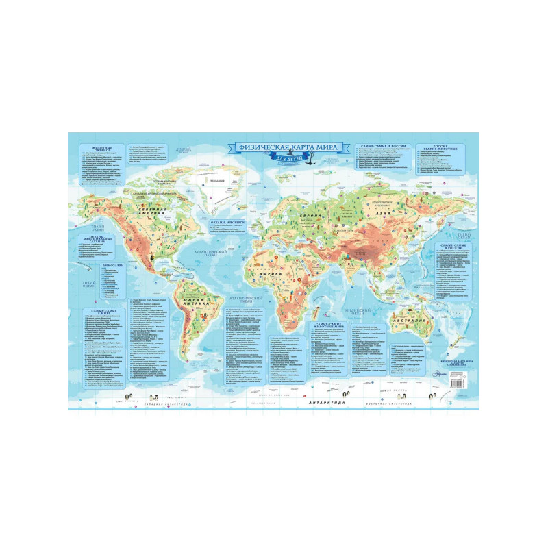 Физическая карта мира, дополненная полезной и интересной информацией о рельефе, климате и природных рекордах на нашей планете, будет полезна школьникам на уроках и при выполнении домашних заданий. Яркие наклейки помогут ребятам лучше усвоить новые знания. Для детей младшего и среднего школьного возраста