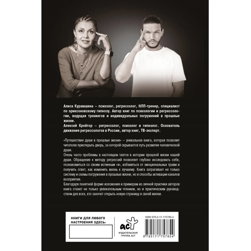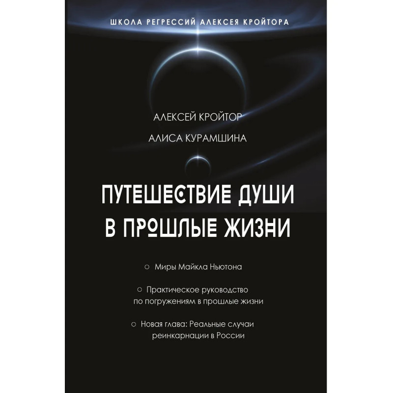 Алиса Курамшина – психолог, регрессолог, НЛП-тренер, специалист по эриксоновскому гипнозу. Автор книг по психологии и регрессологии, ведущая тренингов и индивидуальных погружений в прошлые жизни. Алексей Кройтор – регрессолог, психолог и гипнолог. Основатель движения регрессологов в России, автор книг, ТВ-эксперт. "Путешествие души в прошлые жизни" — уникальная книга, которая позволит читателю приоткрыть дверь, за которой скрывается путь развития человеческой души. Очень часто проблемы в настоящем таятся в истории прошлой жизни нашей души. Обращение к методу регрессий позволяет глубоко исследовать себя, познакомиться со своим истинным "я", избавиться от эмоциональных травм и получить ответ, как изменить жизнь к лучшему. Книга затрагивает не только систему и схемы погружения в прошлые жизни, но и способы активации каналов восприятия.