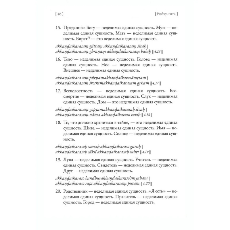 Рибху-гита, являющаяся частью древнего писания Шиварахасья-пураны (Тайное учение Шивы), открывает знание о природе реальности, единосущем я, неделимом сознании, а также описывает заблуждения и иллюзии, искажающие восприятие истины. Неповторимая чистота недвойственного опыта, переданного в Рибху-гите, представляет большой интерес для исследователей таких традиций недвоственности, как адвайта-веданта, мадхьямака, дзен, суфийский мистицизм, неоплатонизм, а также подходов, изложенных в работах псевдо-Дионисия Ареопагита, Григория Паламы, Николы Кузанского, Джорджа Беркли и в современных исследованиях, посвященных квантовому монизму, радикальному конструктивизму и постсубъектной метафизике.Рибху-гита на русском языке публикуется впервые.