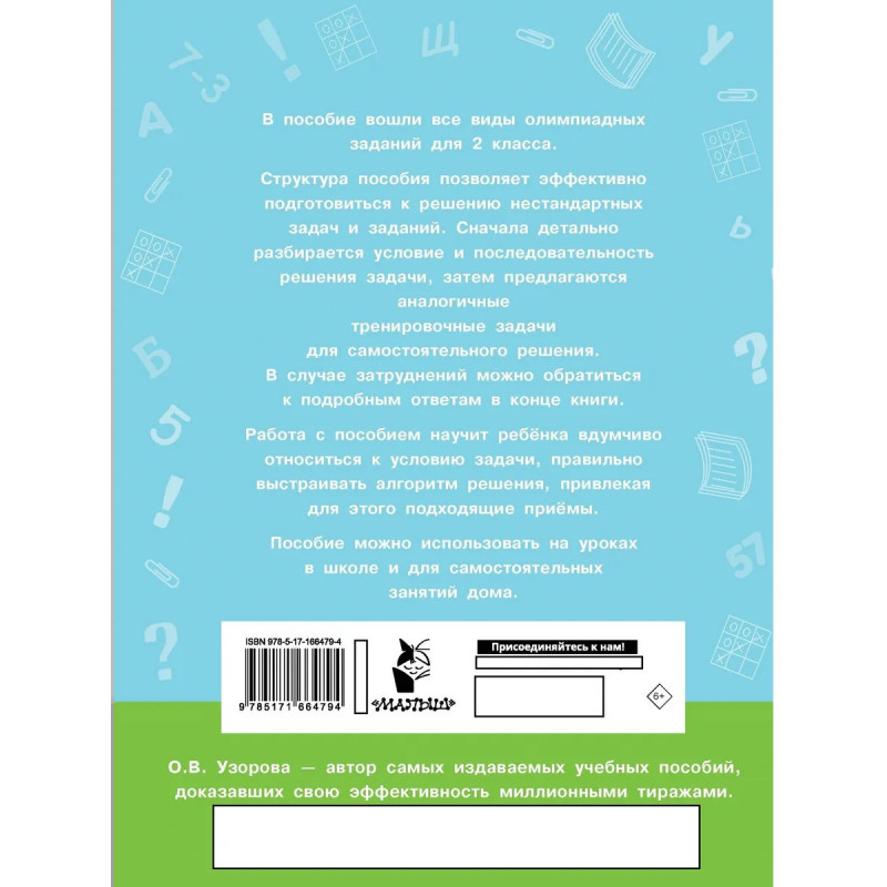 В пособие вошли все виды олимпиадных заданий по математике для 2 класса. Пособие позволяет эффективно подготовиться к решению олимпиадных нестандартных задач и заданий по математике. Сначала детально разбирается условие и последовательность решения задачи, затем предлагаются аналогичные тренировочные задачи для самостоятельного решения. В случае затруднений можно обратиться к подробным ответам в конце книги. Работа с пособием научит ребёнка вдумчиво относиться к условию задачи, правильно выстраивать алгоритм решения, привлекая для этого подходящие приемы.