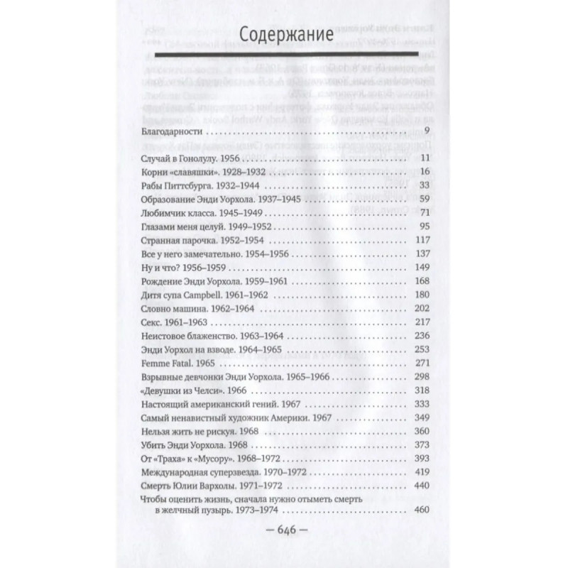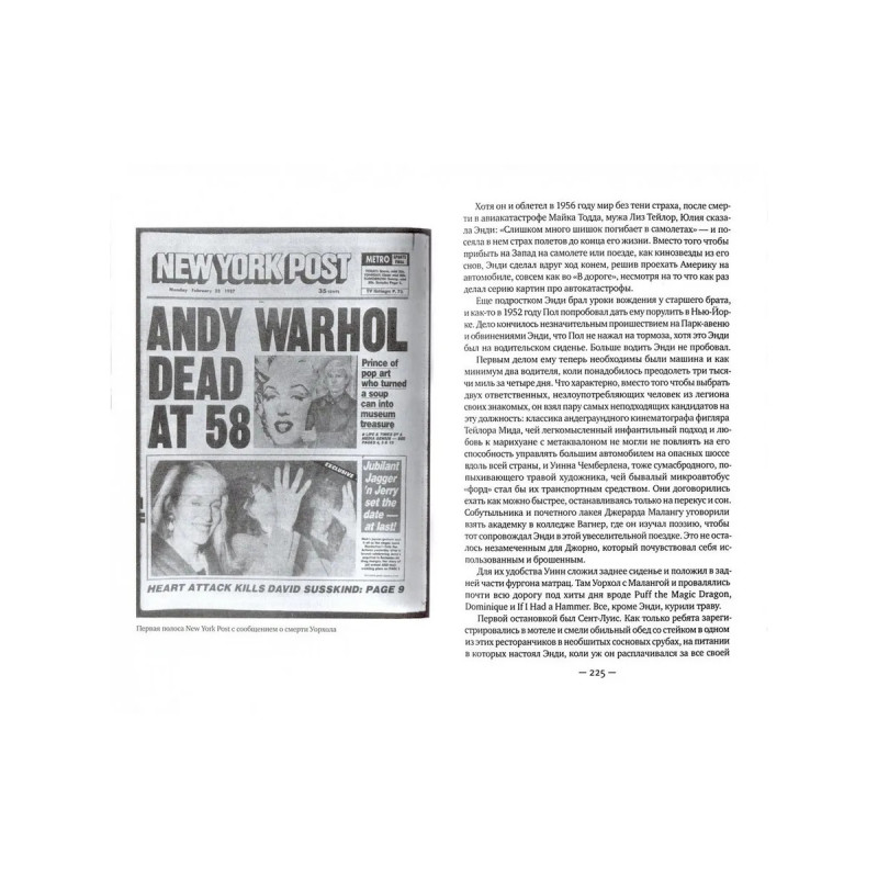Биография Виктора Бокриса погружает в мир основателя поп-арта. В ней жизнь Энди Уорхола предстает коллажем встреч, художественных придумок, влюбленностей, творческих успехов, бизнес-проектов, трагедий — такой, какой ее прожил сам художник и какой ее запомнили его близкие и враги, любовники и ненавистники. Здесь множество правд и голосов — всех тех, кто оказался в уорхоловской орбите, кто потрудился на его «Фабрике» и над его кинокартинами. Но они лишь хор, усиливающий сольную партию, принадлежащую самому Уорхолу.