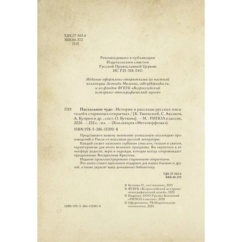 Сост. Буткова О. Пасхальное чудо. Истории и рассказы русских писателей в старинных открыткахПредставляем вашему вниманию уникальную коллекцию произведений о Пасхе от классиков русской литературы.Каждый сюжет наполнен глубоким смыслом, теплом и светом,характерными для этого великого праздника. Вы окунетесь в атмосферу радости, веры и надежды, которая всегда сопровождает празднование Воскресения Христова.Издание проиллюстрировано старинными открытками.Эта книга станет идеальным подарком для ваших близких и друзей, а также украсит вашу домашнюю библиотеку.