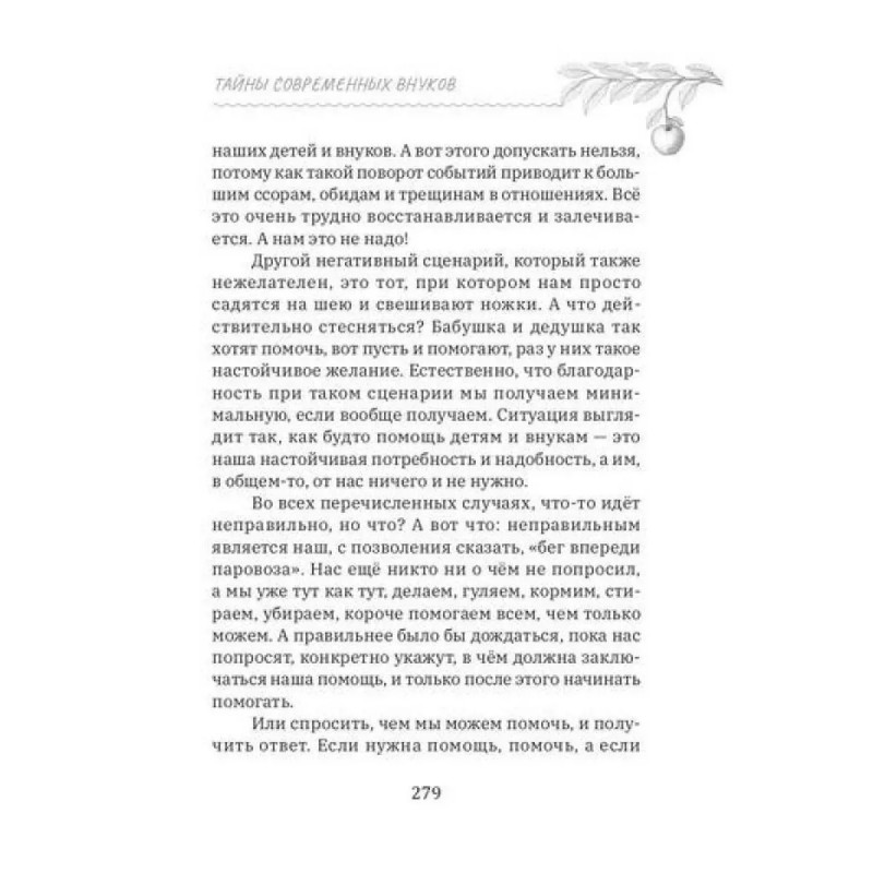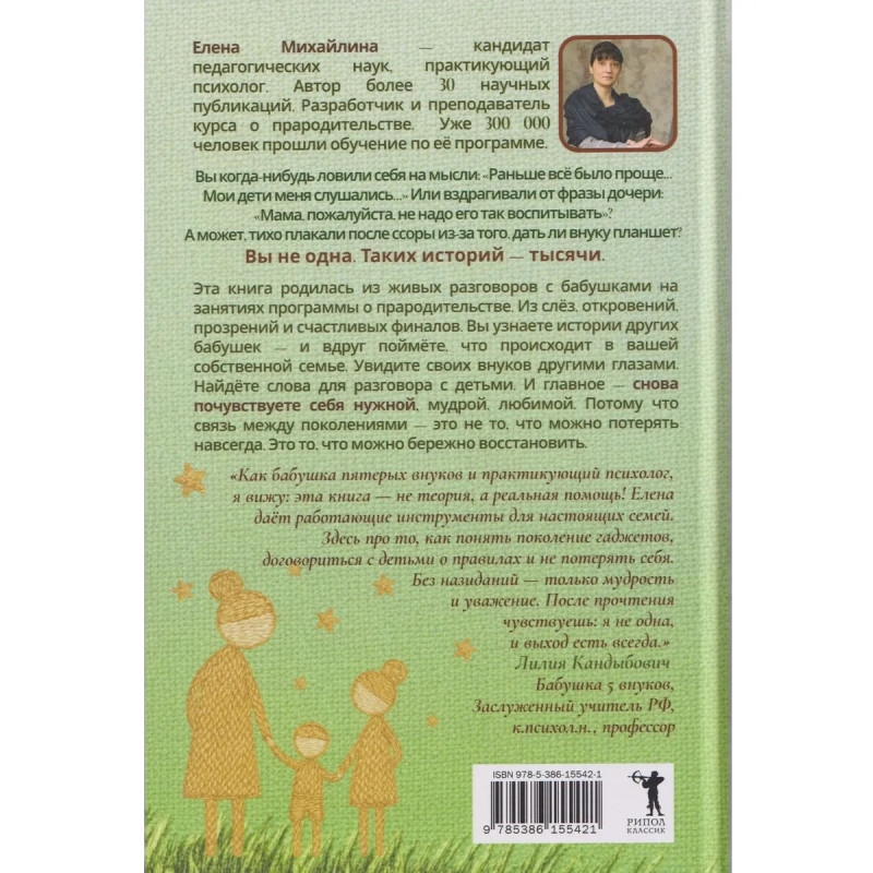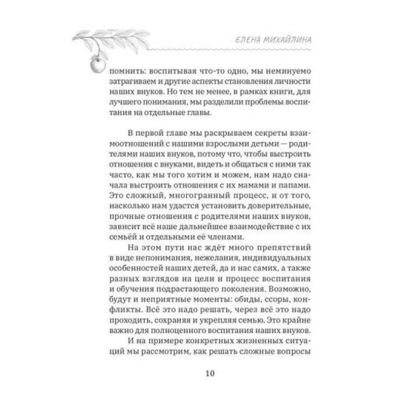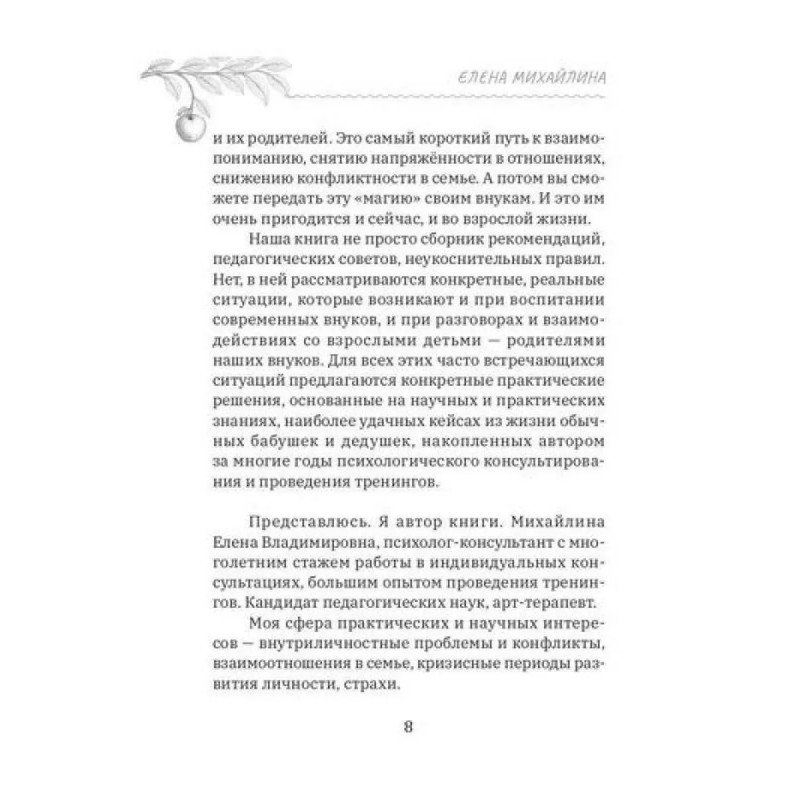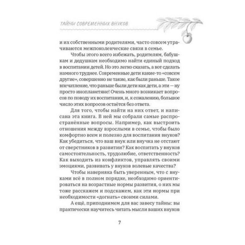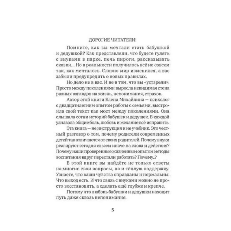 Книга адресована широкому кругу читателей, но, в первую очередь, старшему поколению — бабушкам и дедушкам, чья роль в семейном воспитании в последние годы претерпевает серьёзные изменения. На примере большого количества часто встречающихся проблемных ситуаций и детального «разбора полётов» автор предлагает конкретные решения, основанные на научных и практических знаниях, подсказывает, как бабушкам и дедушкам найти единый с родителями внуков подход в воспитании младшего поколения, каким образом избежать разногласий, споров и ссор в семье, снять напряжённость в отношениях с внуками и не входить в конфликт с их родителями.