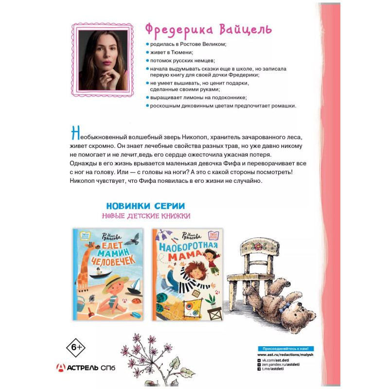 Волшебная сказка для дошкольников про дружбу девочки с хранителем леса, умеющим готовить целительные снадобья. Адресовано всем любителям "Хроник Нарнии", "Золотого компаса", "Малефисенты" и "Тёмных начал". Автор пишет не только про фантазийные, но и про настоящие растения русского леса средней полосы Европейской части России.