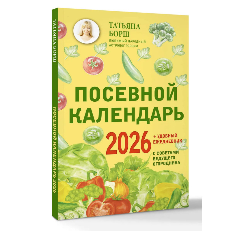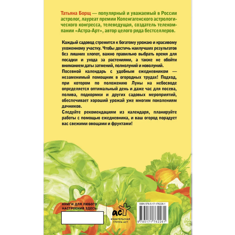 Татьяна Борщ — популярный и уважаемый в России астролог, лауреат премии Копенгагенского астрологического конгресса, телеведущая, создатель телекомпании "Астра-Арт", автор целого ряда бестселлеров. Каждый садовод стремится к богатому урожаю и красивому ухоженному участку. Чтобы достичь наилучших результатов без лишних хлопот, важно правильно выбрать время для посадки и ухода за растениями, а также не обойти вниманием даты затмений, полнолуний и новолуний. Посевной календарь с удобным ежедневником — незаменимый помощник в огородных трудах! Подход, при котором по положению Луны на небосводе определяется оптимальный день и даже час для посева, полива, подкормки и других садовых мероприятий, обеспечивает хороший урожай уже многим поколениям дачников. Следуйте рекомендациям из календаря, планируйте работы с помощью ежедневника, и ваш огород порадует вас свежими овощами и фруктами!