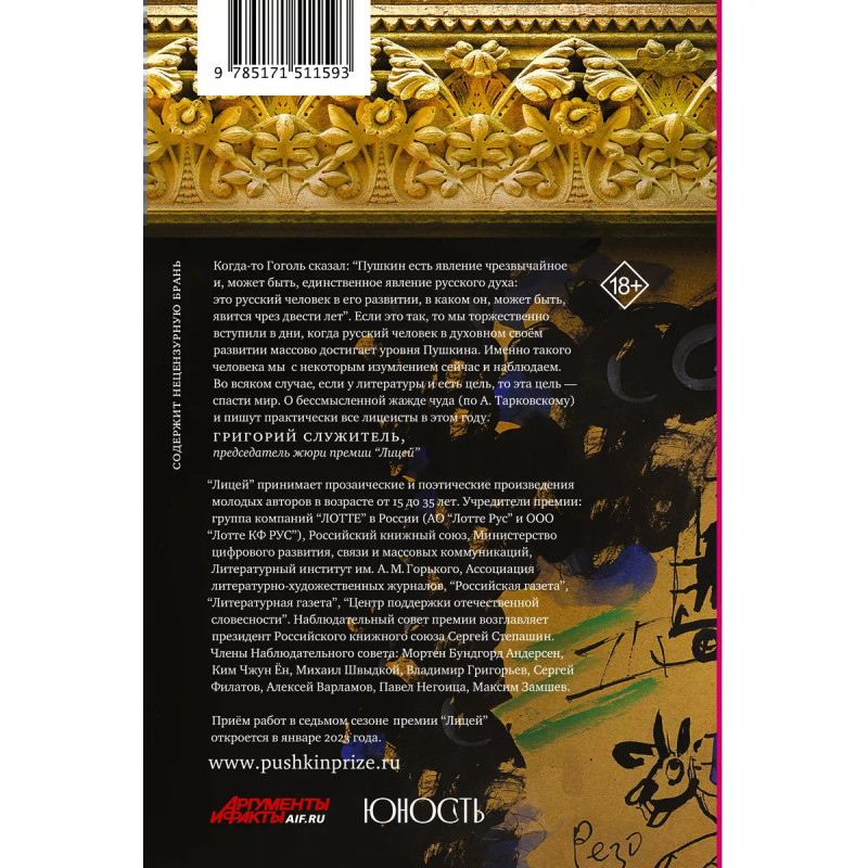 Лицей 2022. Шестой выпуск. Литературная премия для молодых авторов "Лицей" вручается с 2017 года. За это время было открыто множество новых имён. Тексты финалистов и лауреатов были изданы в лучших издательствах страны. На соискание премии "Лицей" в 2022 году было прислано 2 139 работ со всех уголков России, возраст участников от 20 до 35 лет. В сборник вошли тексты шести лучших из них. В сборник "Лицей 2022. Шестой выпуск" вошли тексты победителей 2022 года - прозаиков Екатерины Манойло, Михаила Турбина, Алексея Колесникова и поэтов Оли Скорлупкиной, Дениса Балина, Антона Азаренкова. Будущее актуальной российской литературы формируется здесь и сейчас: этот сборник - современность глазами молодых. "Если можно было бы выделить одну общую для всех авторов тему, то, думаю, этой темой стало бы оживление, реанимация (как физическая, так и метафизическая) или даже воскресение". Григорий Служитель, председатель жюри.