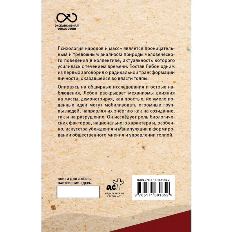 "Психология народов и масс" является проницательным и тревожным анализом природы человеческого поведения в коллективе, актуальность которого усилилась с течением времени. Гюстав Лебон одним из первых заговорил о радикальной трансформации личности, оказавшейся во власти толпы. Опираясь на обширные исследования и острые наблюдения, Лебон раскрывает механизмы влияния на массы, демонстрируя, как простые, но умело поданные идеи могут мобилизовать огромные группы людей, направляя их энергию как на созидание, так и на разрушение. Он исследует роль биологических факторов, национального характера и, особенно, искусства убеждения и манипуляции в формировании общественного мнения и управлении толпой.