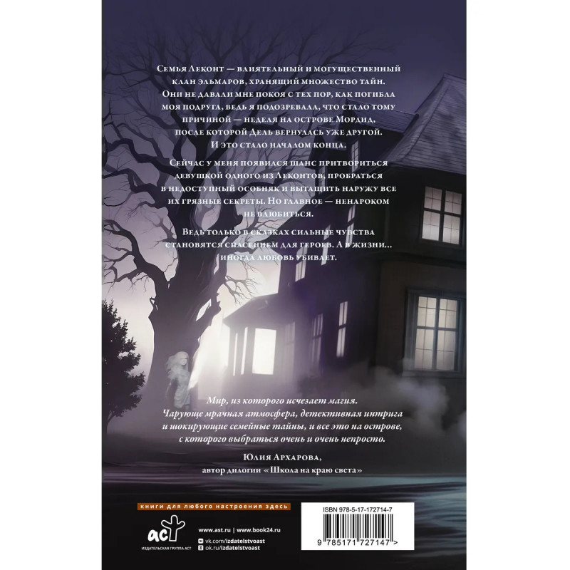 – Мрачное фэнтези об интригах внутри могущественной магической семьи с фоновой романтической линией. – От творческого дуэта авторов романов «Магическая невеста», «Брачная игра сестер Блэкторн» и «Твоя по ошибке». – Сеттинг темного поместья на отдаленном острове – атмосферного и пугающего места, куда непросто попасть и откуда еще сложнее выбраться. – Какую цену придется заплатить эльмарам, чтобы сохранить магические способности? – Понравится поклонникам мистики, детективов и сериалов «Падение дома Ашеров», «Клуб полуночников», «Призраки поместья Блай».