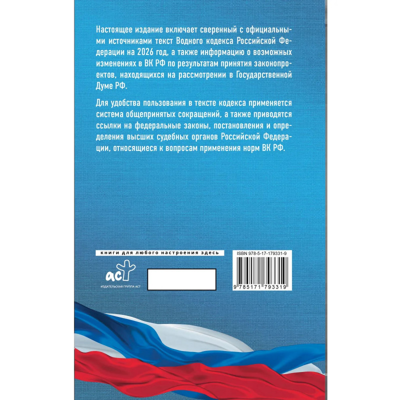 Данное издание Водный кодекса РФ сверено с официальным источником и приводится по состоянию на 2026 год. Кодекс учитывает все изменения, опубликованные в официальных источниках на момент подписания издания в печать. В издании представлена информация о возможных изменениях в ВК РФ по результатам принятия законопроектов, находящихся на рассмотрении в Государственной Думе РФ. Для удобства пользования в тексте кодекса применяется система общепринятых сокращений, а также приводятся ссылки на федеральные законы, относящиеся к вопросам применения норм ВК РФ.