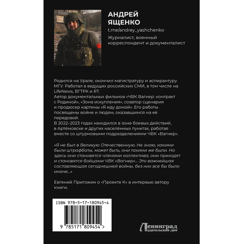– Документальная книга о «Проекте K» — одном из самых закрытых и противоречивых эпизодов современной военной истории. – Путь героев через крайние формы насилия, риска и морального выбора — от тюрьмы к фронту, от несвободы к попытке искупления. – Репортажная проза, основанная на личных наблюдениях, интервью и работе автора в зоне боевых действий. Книга написана без художественного приукрашивания — с акцентом на факты, человеческие судьбы и цену принятых решений. – Андрей Ященко — российский кинодокументалист, журналист, продюсер и сценарист с опытом работы на федеральных медиа и в видеопроекте «The Люди». Лауреат Студенческого ТЭФИ. Автор документального фильма о частной военной компании «Вагнер», снятого совместно с режиссером Владиславом Рытковым. – Издание дополнено авторскими фотографиями с передовой.