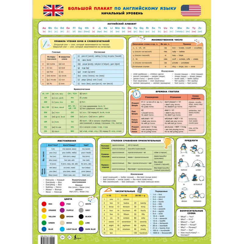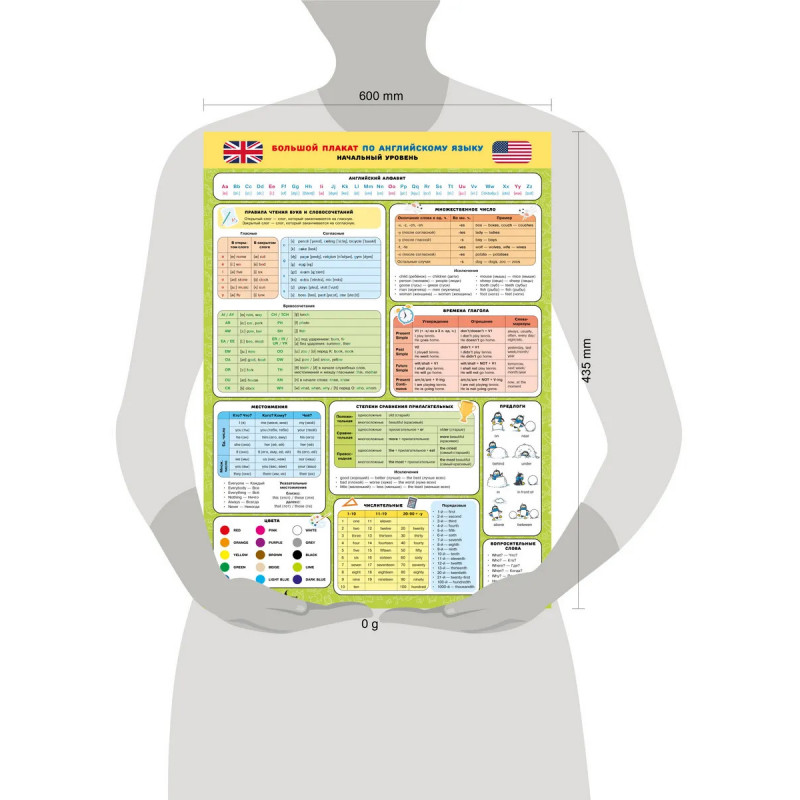 Как заинтересовать ребёнка в английском, если он всё забывает уже на следующий день? Мучительные списки слов, путаница во временах, бесконечные "это мы уже проходили" — знакомо каждому родителю. Но теперь есть наглядное решение, которое поможет всё удержать: если не в голове, то перед глазами! Большой красочный плакат (формат 43,5×60 см) по английскому языку — это компактная и визуально понятная шпаргалка для начального уровня. Здесь собрано всё, что действительно нужно в начале пути: правила чтения, времена, числительные, местоимения, формы сравнения, предлоги, цвета и многое другое. Вся информация структурирована в наглядные таблицы и легко воспринимается. Плакат создан для младших и средних школьников, но будет полезен всем, кто только начинает изучать английский — независимо от возраста.