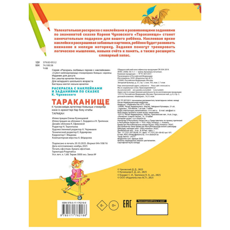 Увлекательная раскраска с наклейками и развивающими заданиями по знаменитой сказке Корнея Чуковского "Тараканище" станет замечательным подарком для вашего ребёнка. Наклеивая яркие наклейки и раскрашивая забавные картинки, ребёнок будет развивать внимание и мелкую моторику. Задания помогут тренировать логическое мышление, навыки счёта и память, а также расширять словарный запас.