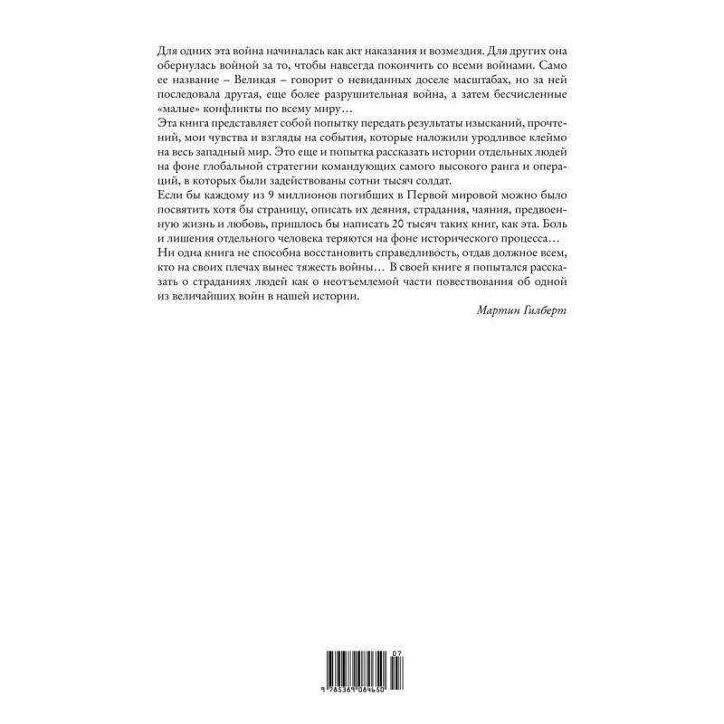 Никто не хотел, чтобы эта война началась, но в результате сплетения обстоятельств, которые могут показаться случайными, она оказалась неотвратимой. Участники разгоравшегося конфликта верили, что война не продлится долго и к Рождеству 1914 года завершится их полной победой, но перемирие было подписано только четыре с лишним года спустя, в ноябре 1918-го. Первая мировая война привела к неисчислимым страданиям и жертвам на фронтах и в тылу, к эпидемиям, геноциду, распаду великих империй и революциям. Она изменила судьбы мира и перекроила его карты. Многие надеялись, что эта война, которую назвали Великой, станет последней в истории, но она оказалась предтечей еще более разрушительной Второй мировой. Всемирно известный британский историк сэр Мартин Гилберт написал полную историю Первой мировой войны, основываясь на документальных источниках, установленных фактах и рассказах очевидцев, и сумел убедительно раскрыть ее причины и изложить следствия.