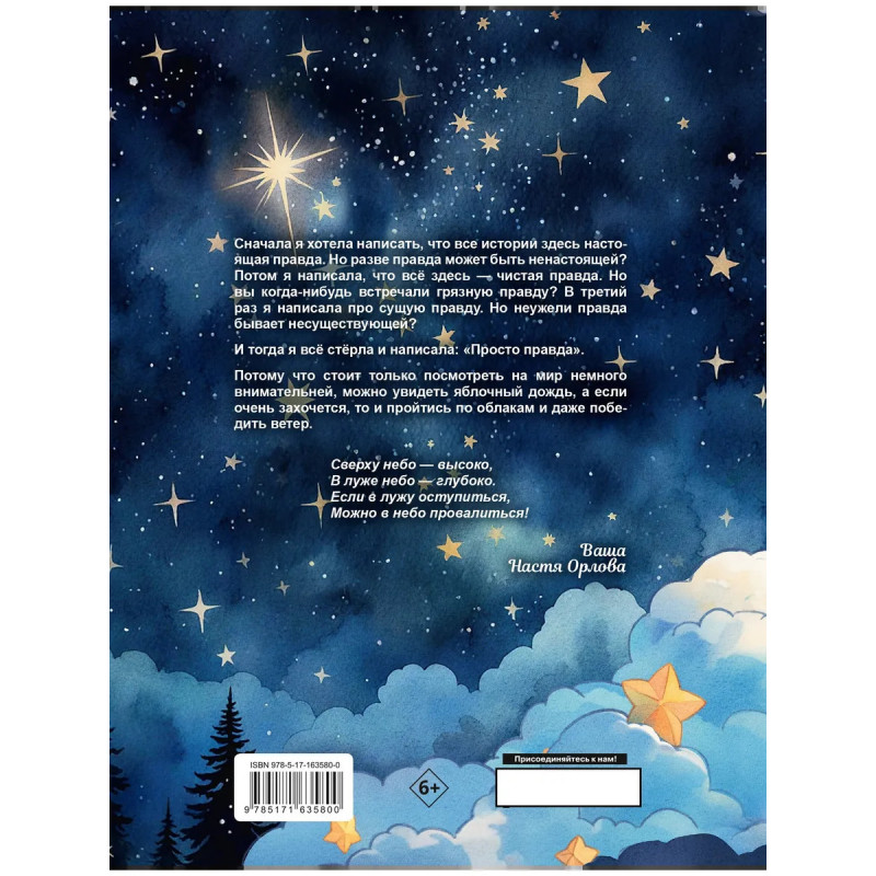 Где расцветает наша душа? Почему звёзды — плачут? Как победить ветер с помощью зонтика? А как можно весело провести время с семьёй дома и на море? Ответы на эти и другие вопросы ваш ребёнок найдёт в сборнике коротких рассказов, а ещё запоминающихся и глубоких по смыслу стихотворений одной из самых лучших современных детских поэтов и писателей Анастасии Орловой! Каждую страничку украшают яркие, живые и тёплые иллюстрации Катерины Мироновой. "Сначала я хотела написать, что все истории здесь настоящая правда. Но разве правда может быть ненастоящей? Потом я написала, что всё здесь — чистая правда. Но вы когда-нибудь встречали грязную правду? В третий раз я написала про сущую правду. Но неужели правда бывает несуществующей? И тогда я всё стёрла и написала: «Просто правда». Потому что стоит только посмотреть на мир немного внимательней, можно увидеть яблочный дождь, а если очень захочется, то и пройтись по облакам и даже победить ветер". Ваша Настя Орлова