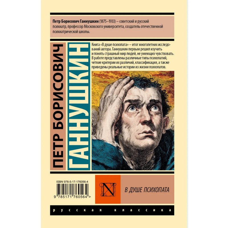 — Петр Борисович Ганнушкин — известный русский и советский психиатр, профессор Московского университета, создатель отечественной психиатрической школы. — Книга «В душе психопата» подводит итог многолетним исследованиям автора. — В книге Ганнушкин впервые представил различные типы психопатий, а также четкие критерии их различий. — Издание в серии «Эксклюзив: Русская классика» — в удобном карманном формате и узнаваемом оформлении.