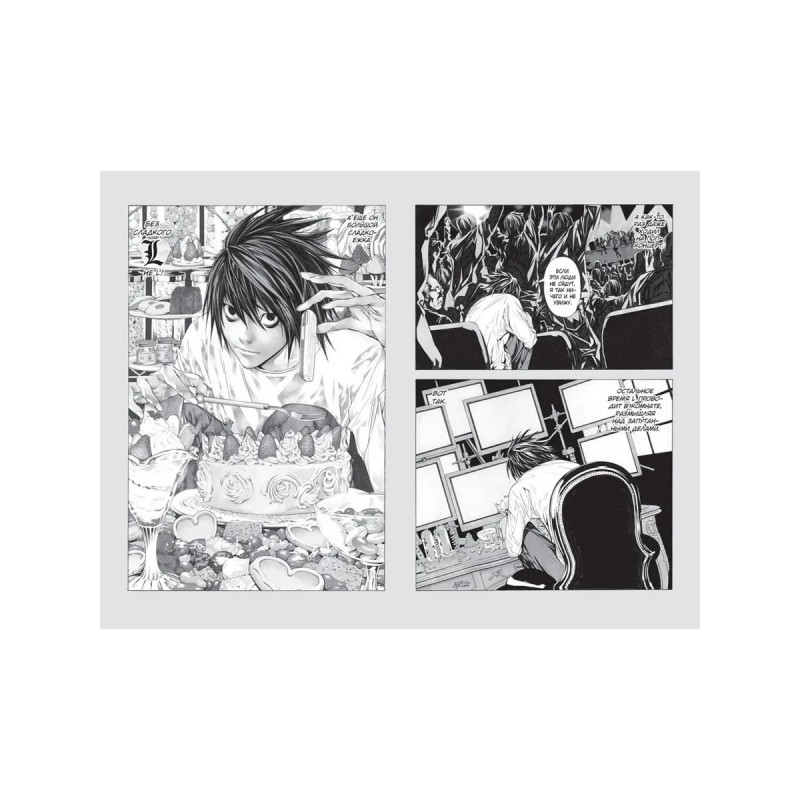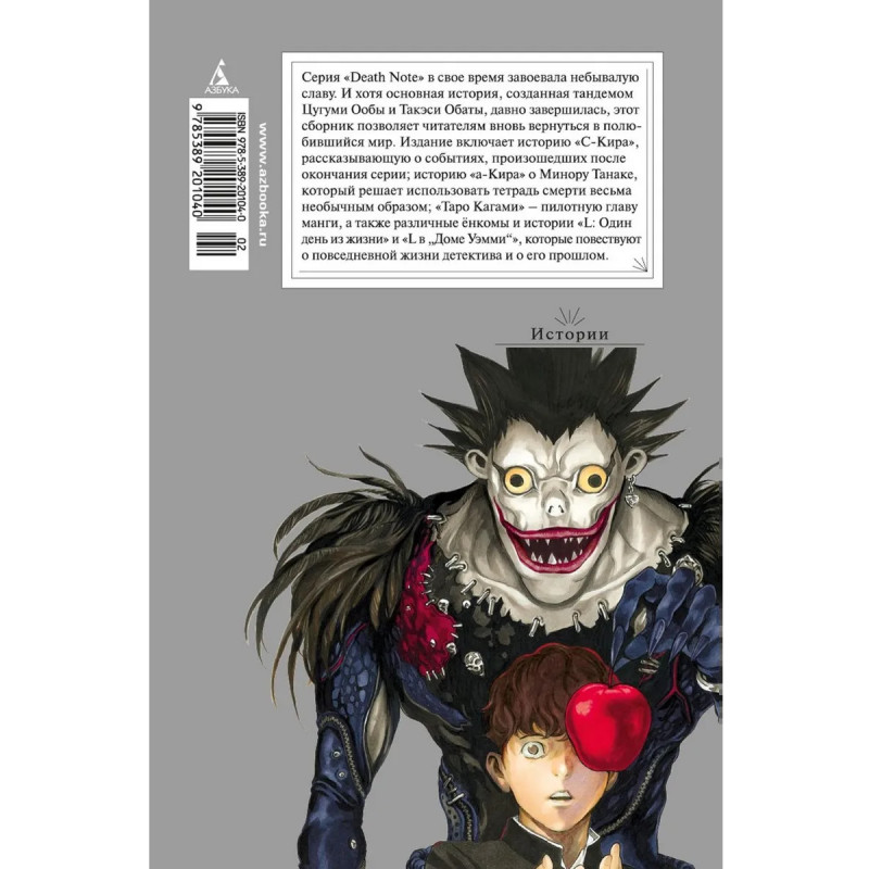 Серия «Death Note» в свое время завоевала небывалую славу и стала настоящим манга-феноменом. И хотя основная история, созданная тандемом Цугуми Ообы и Такэси Обаты, давно завершилась, этот сборник позволяет читателям вновь вернуться в полюбившийся мир. Издание включает историю «C-Кира», рассказывающую о событиях, произошедших после окончания серии; историю «a-Кира» о Минору Танаке, который решает использовать тетрадь смерти весьма необычным образом; «Таро Кагами» – пилотную главу манги, а также различные юмористические ёнкомы и истории «L: Один день из жизни» и «L в «Доме „Уэмми“», которые повествуют о повседневной жизни детектива и о его прошлом.
