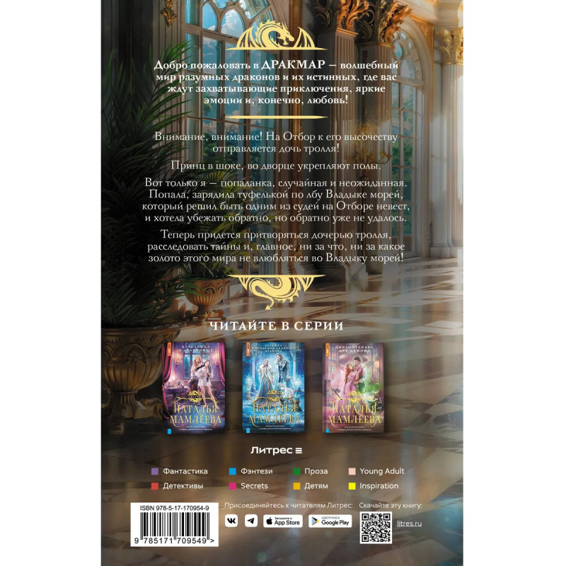 - Седьмая книга авторского цикла фэнтези «Дракмар». - Необычный ретеллинг «Спящей красавицы» в декорациях волшебной академии. - История девушки Киры, попавшей в волшебный мир. Личность героини — загадка для всех жителей Саттора, её главная цель — вернуться в свой мир, но пока все идет не по плану. - История Киры наполнена светлым юмором и романтикой. Любовь — главная тема книги. В том числе и любовь к себе — умение ценить в себе не столько внешнюю оболочку. Именно так и поступает Кира, которая точно знает себе цену. Ее стойкий нрав не оставит равнодушным ни одного читателя! - Наталья Мамлеева — топовый автор Литреса.